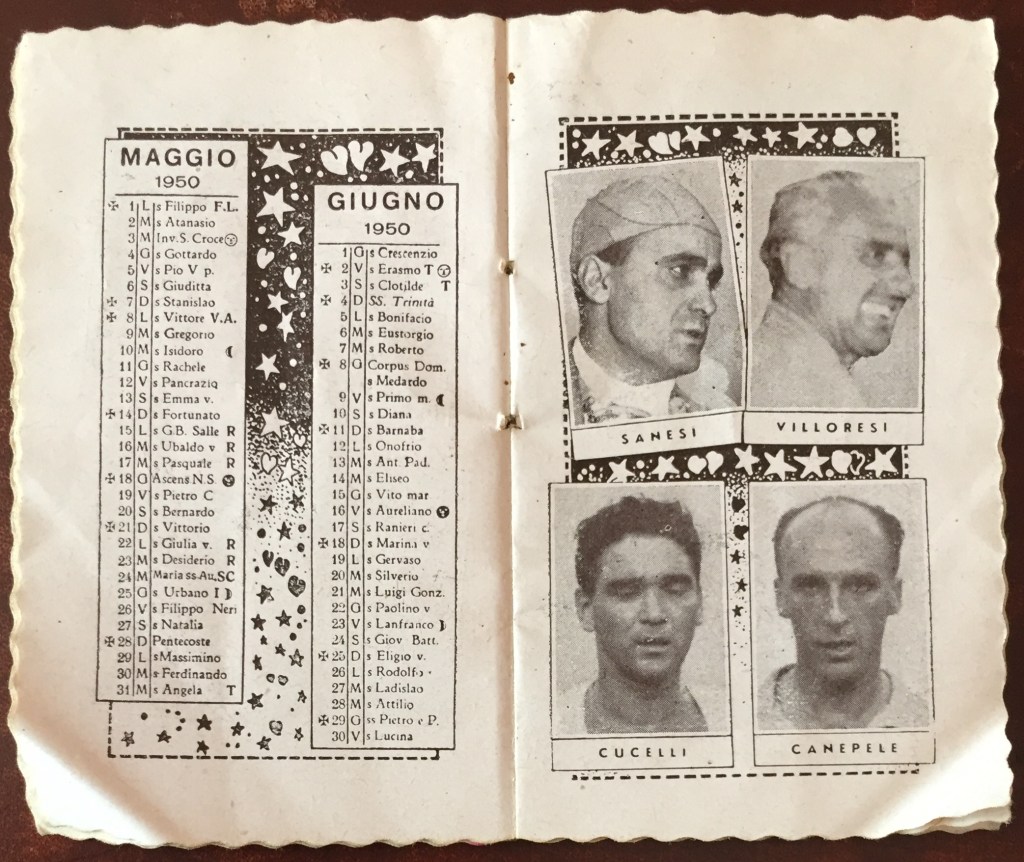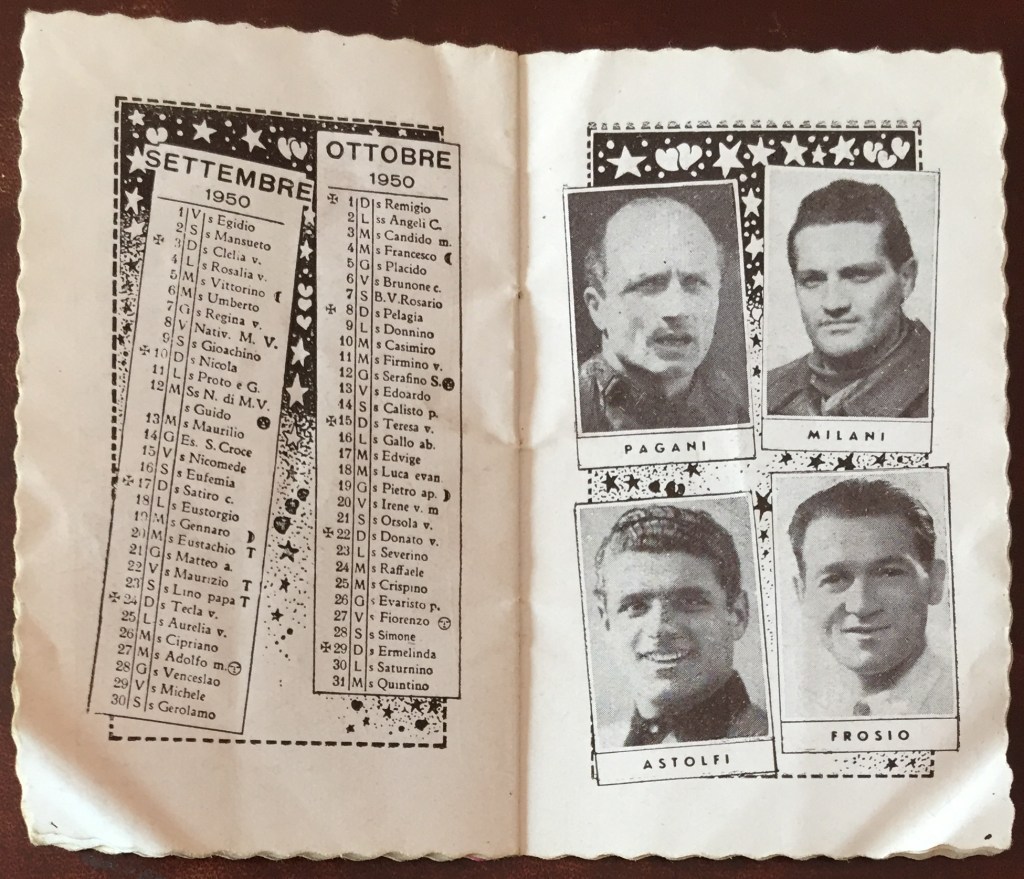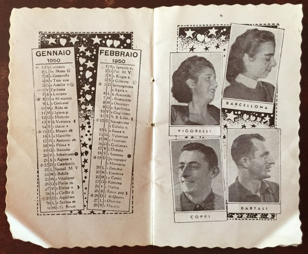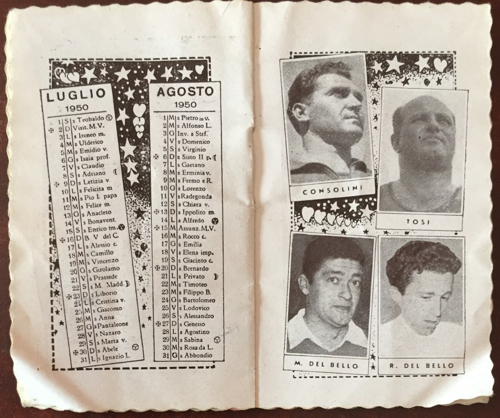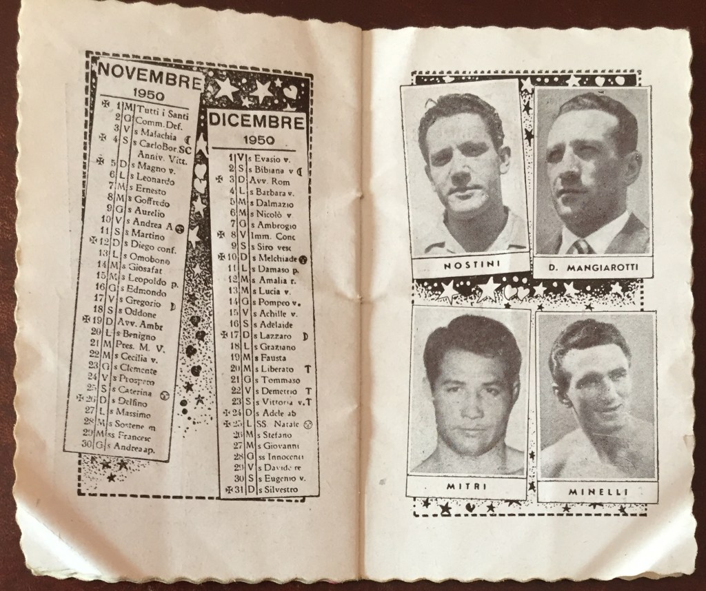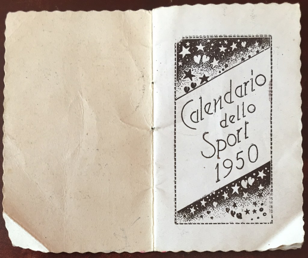 Come raccontato nella Part 5 di Giani 2019, il Calendario dello Sport 1950 è una piccola pubblicazione promozionale della distilleria Masera di Seveso/Milano, specializzata in zabaglioni e aperitivi – la copia qui presentata è tratta dall’archivio personale di Giovanna Boccalini Barcellona, madre della pattinatrice Grazia Barcellona. Fonte solo all’apparenza efemerale, il libretto permette di farsi un’idea di quali potessero essere all’epoca i campioni (ma pure le campionesse) conosciuti dal grande pubblico dell’epoca, stante il fatto che ovviamente gli autori tendessero a “spalmare” la scelta fra varie discipline sportive, senza limitarsi a calcio e ciclismo.