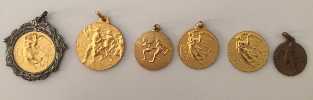Si riconoscono: [A] Medaglia d’oro con cornice, raffigurante Vittoria alata; [B] Medaglia d’oro, raffigurante gruppo di corridori; [C] Medaglia d’oro, raffigurante due atlete impegnante in una staffetta; [D] Medaglia d’oro, raffigurante Vittoria Alata; [E] Medaglia d’oro, raffigurante Vittoria Alata; [F] Medaglia di bronzo, raffigurante atleta, probabilmente ostacolista.