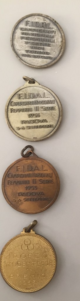 - Medaglia d’argento. Recto: Testa di Vittoria. Verso: “IV RASSEGNA SPORTIVA FEMMINILE 1954 | U.I.S.P – U.D.I.”; all’interno: “Salto in lungo | 2° class.” .