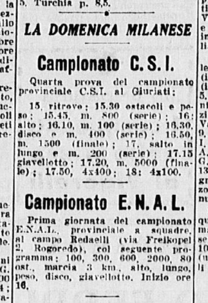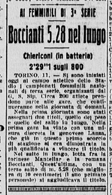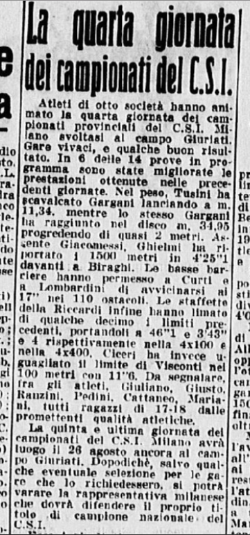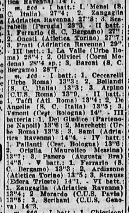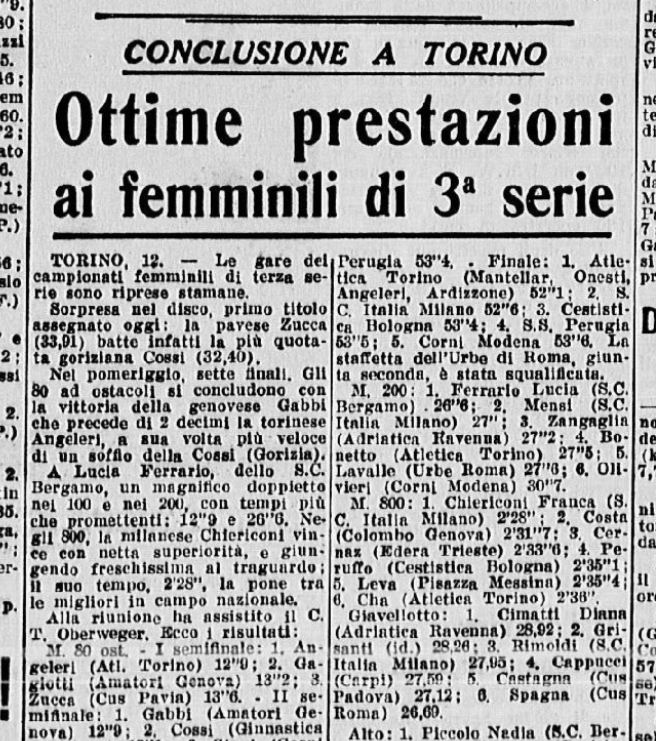 Si parta però dalla medaglia 1. L’11 e il 12 luglio 1953 si svolsero a Torino i Campionati femminili nazionali di III serie, organizzati dalla FIDAL. Nella prima delle due giornate (#6), le atlete dello Sport Club Italia di Milano ottengono buoni risultati. Nei 100m, Bellandi arriva 2° nella prima batteria di qualificazione, (13’’ 3/10), De Angelis 2° nella seconda batteria (13’ 5/10); nei 200m, Mensi arriva 1° nella prima batteria di qualificazione (27’ 4/10); negli 800m, Chiericoni arriva 1° in batteria di qualificazione (2’ 29’’ 1/10).