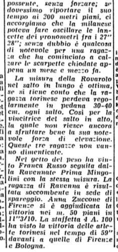 Nella seconda giornate di gare (#7), nei 100m De Angelis arriva 2° nella seconda semifinale (13” 4/10), poi 5° in finale (stesso tempo) Bellende 3° nella terza semifinale (13” 6/10); nei 200m, Mensi arriva 2° (27”); negli 800m, Franca Chiericoni vince (2′ 28”); nel lancio del giavellotto, Rimoldi arriva 3° (m. 27,95); nel salto in alto, De Angelis è 6° (m. 1,35); nella staffetta 4x100m , la squadra dello SC Italia vince la seconda batteria di qualificazione (52” 7/10), classificandosi poi 2° in finale (52” 6/10). Nella classifica finale a squadre, lo SC si classifica 2°, con 28 punti. Visti questi risultati, ragionevolmente Gioia, per quanto non citata, avrà vinto la propria medaglia d’argento nella staffetta 4x100m. La nostra fonte, purtroppo non ci rivela i nomi delle 4 frazioniste, quindi non possiamo avere un ulteriore riscontro che ci sarebbe stato assai utile per giungere ad una certezza più salda.