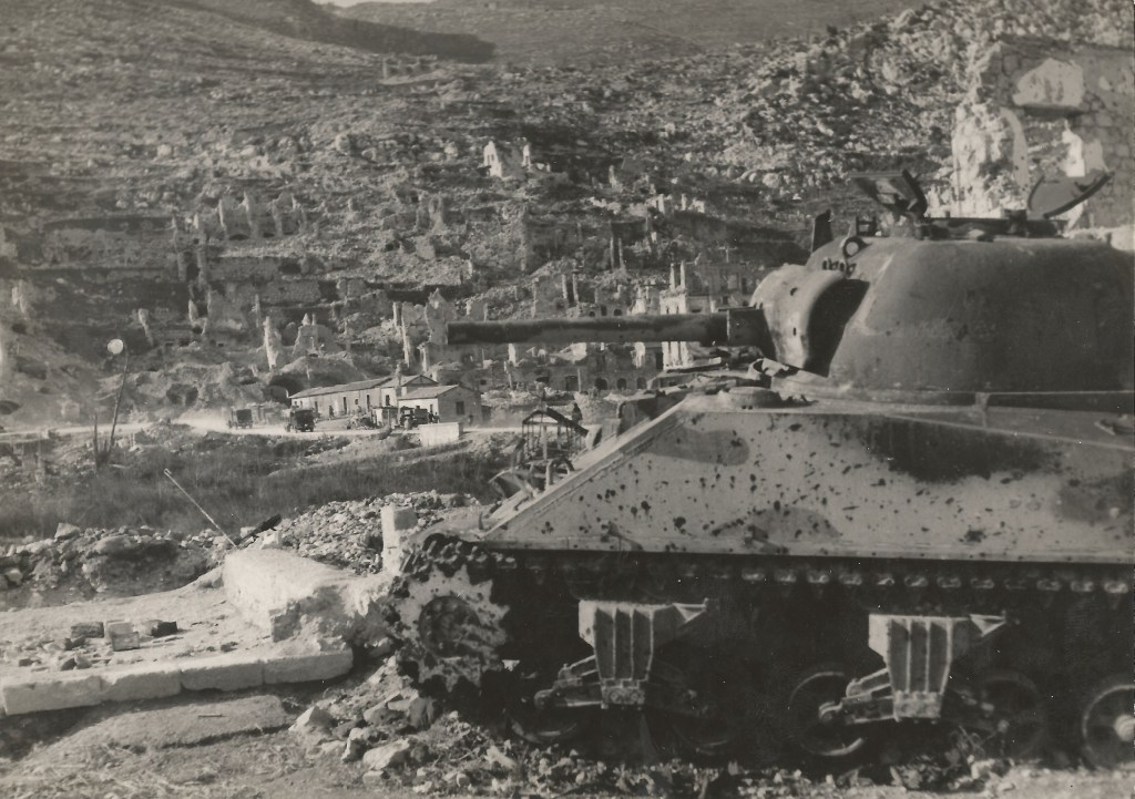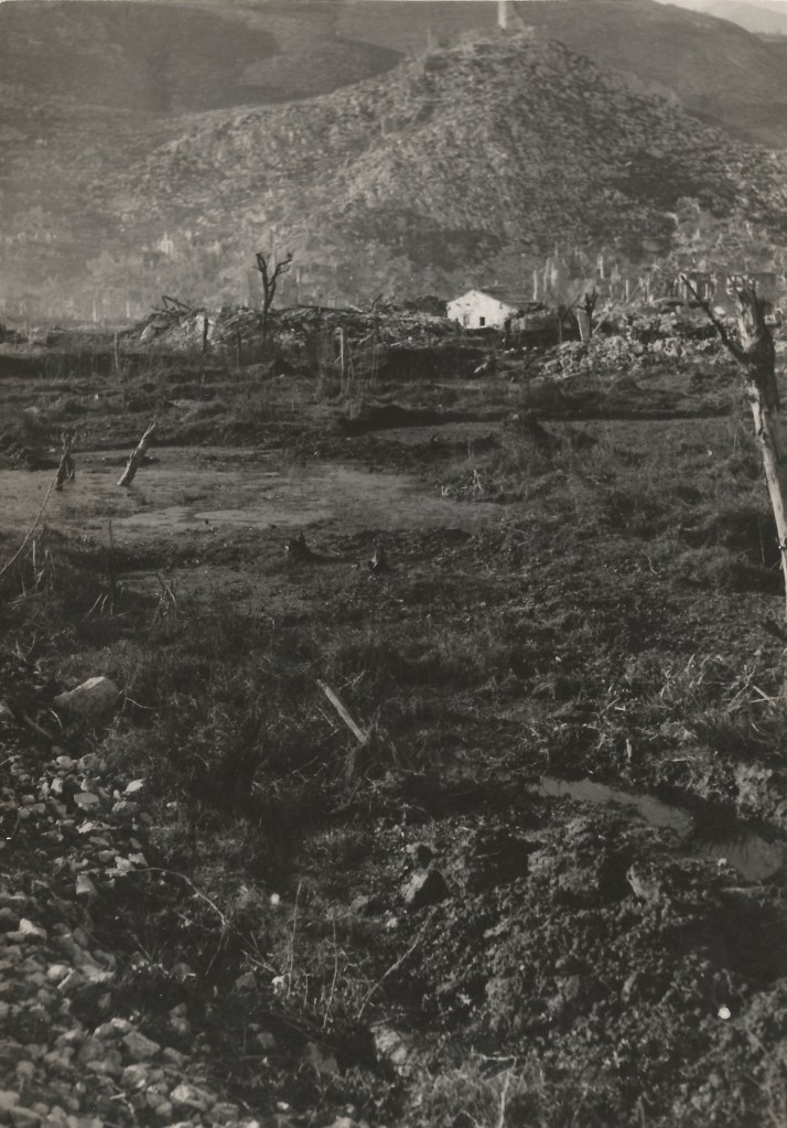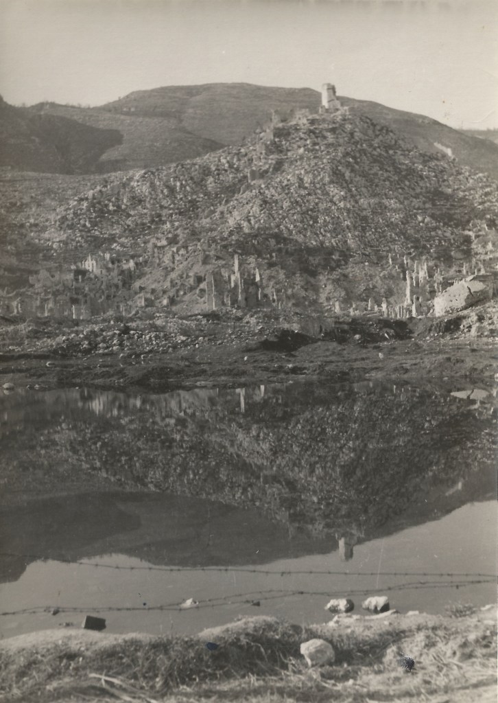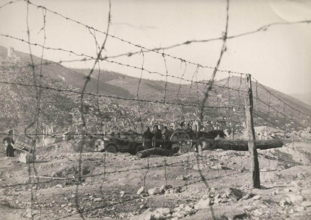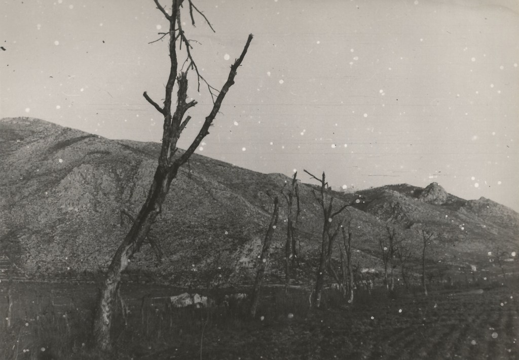 La distruzione e la desolazione del territorio cassinate sono i protagonisti indiscussi anche dalle immagini che seguono e in cui non è solo il paesaggio umano ad essere stato coinvolto dalle cruente operazioni belliche, ma anche quello naturale: gli alberi spogli, scorticati e spezzati gridano nel silenzio le atrocità di uno scontro che portò alla morte di 55.000 soldati alleati e 22.000 tedeschi, per non parlare delle centinaia di civili che morirono, molte/i delle/i quali all’interno dell’abbazia dove si erano rifugiate/i.