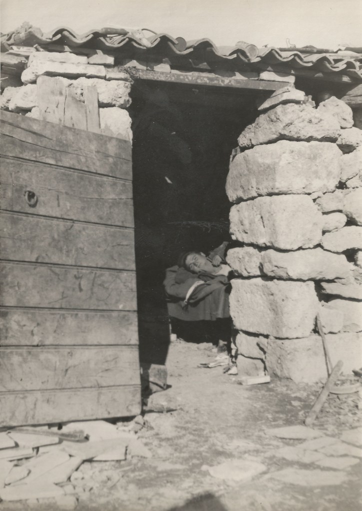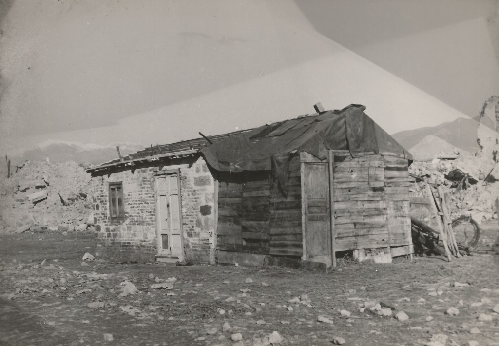 L’area coinvolta dal terribile scontro fu tra quelle più segnate dalla Seconda Guerra Mondiale, la ricostruzione si rivelò complessa e difficile, tra resti bellici, filo spinato, povertà e indigenza, le/gli abitanti di Cassino cercarono di rialzarsi. Nella prima immagine un carrarmato ricorda le fasi più cruente della battaglia; nella seconda, dietro il filo spinato, gruppi di persone parlano tra loro forse alla ricerca di un po’ normalità; nella terza, resti di un pasto di fortuna consumato all’addiaccio e nelle due ultime gli alloggi di fortuna ricavati fra le macerie.
