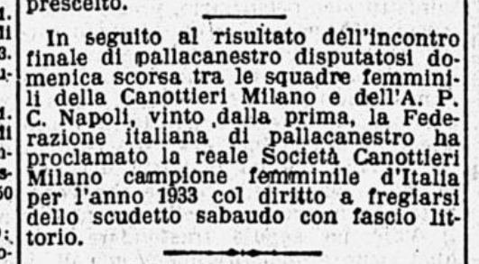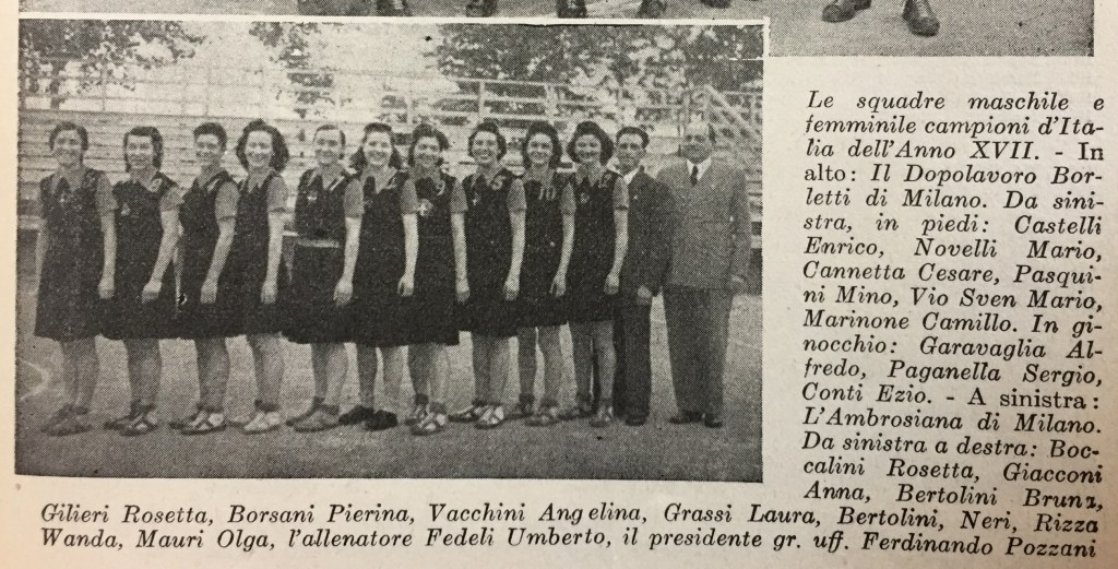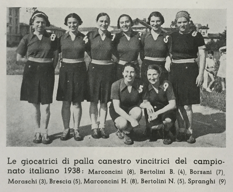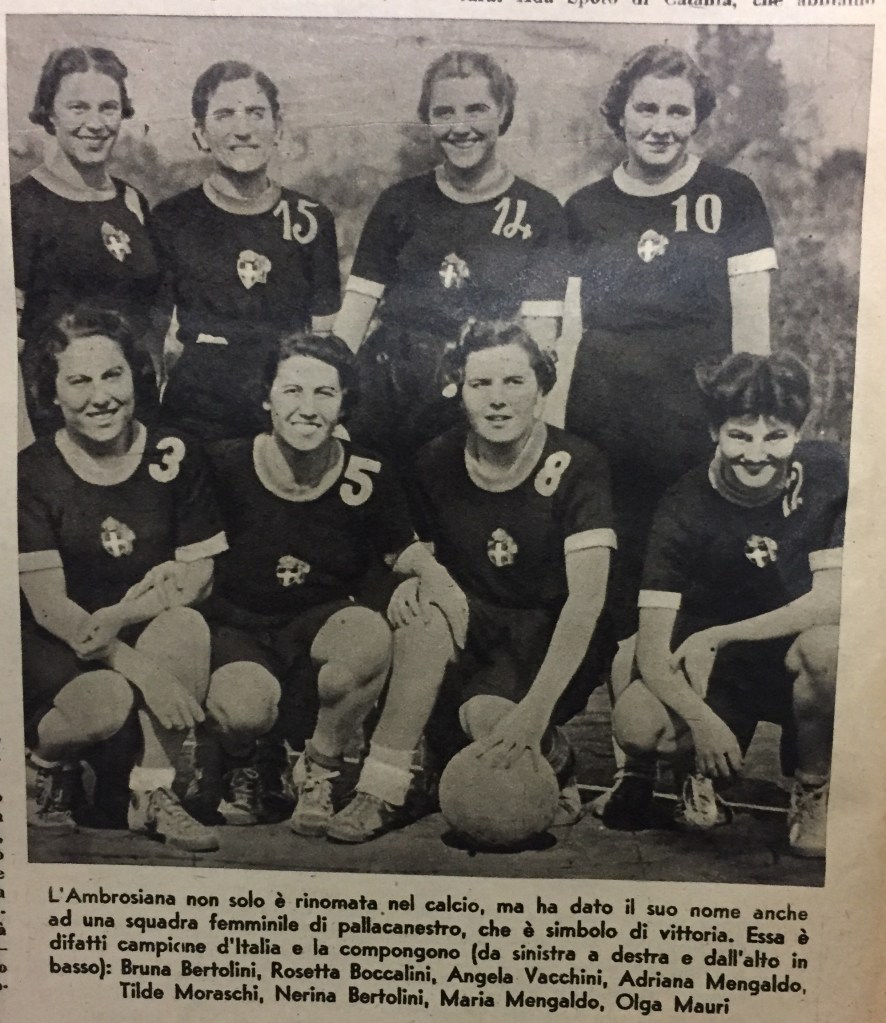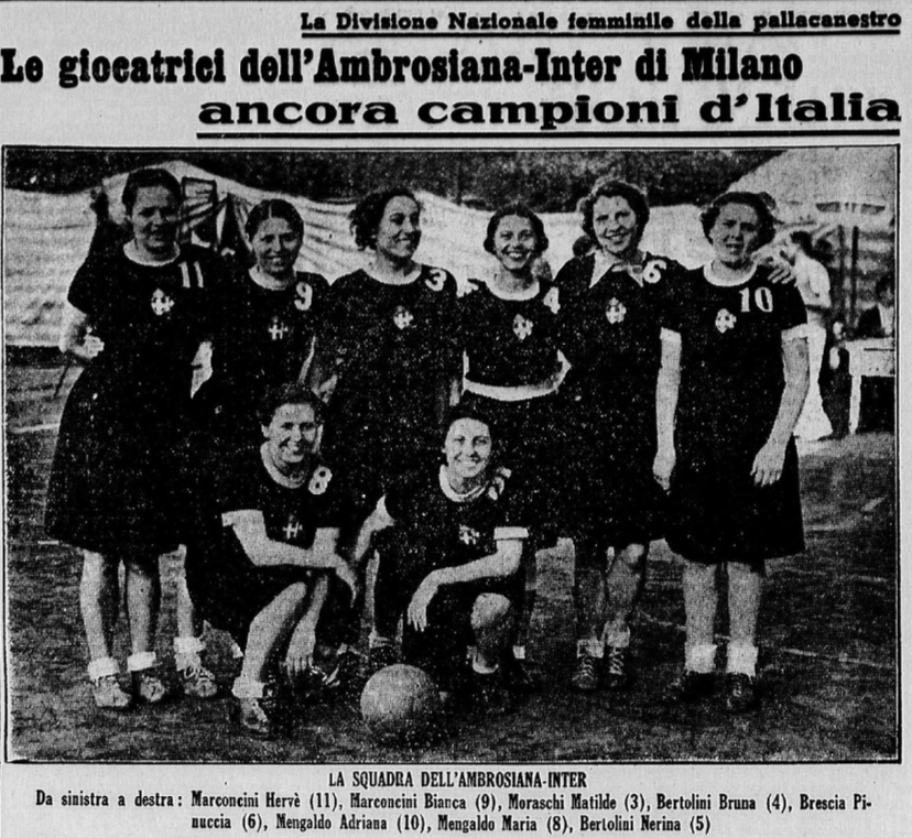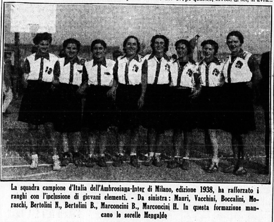 Lo scatto venne pubblicato all’interno di un bell’articolo di Marina Zanetti (Pallacanestro femminile) per il mensile Lo Sport Fascista. All’inizio del pezzo l’autrice loda la conquista dello scudetto da parte delle cestiste dell’Ambrosiana, che così elenca: “Bertolini N., Mengaldo A., Mengaldo M., Moraschi M., Brescia C., Marconcini H., Bertolini B., Marconcini B.”.