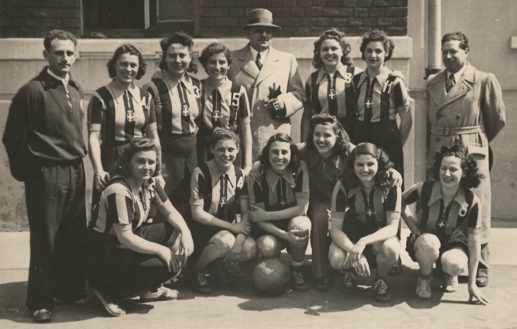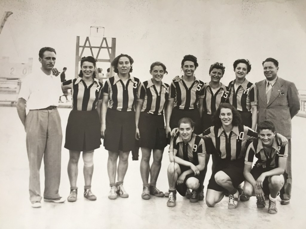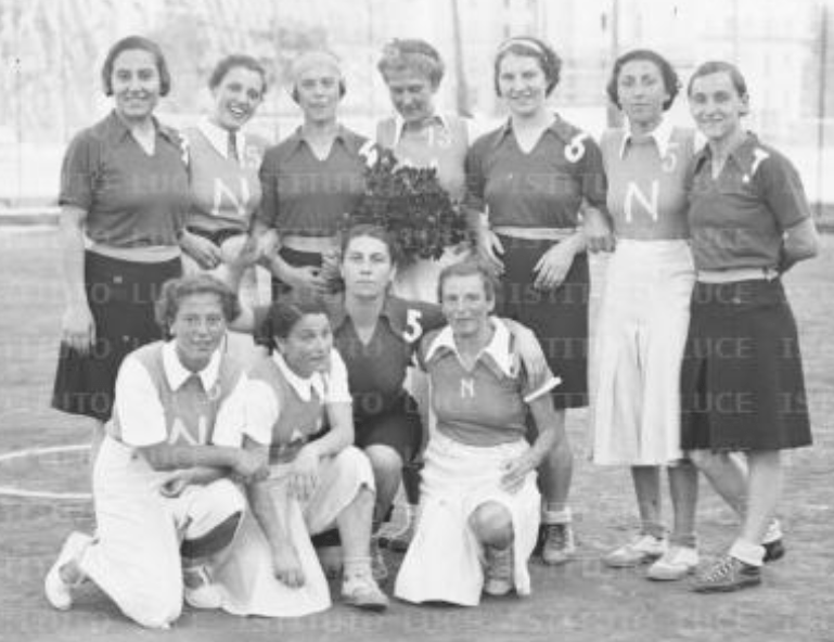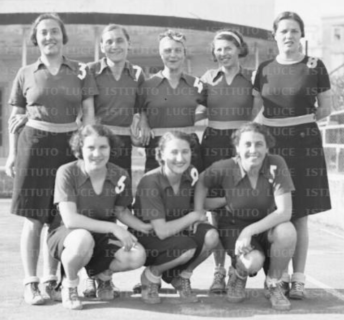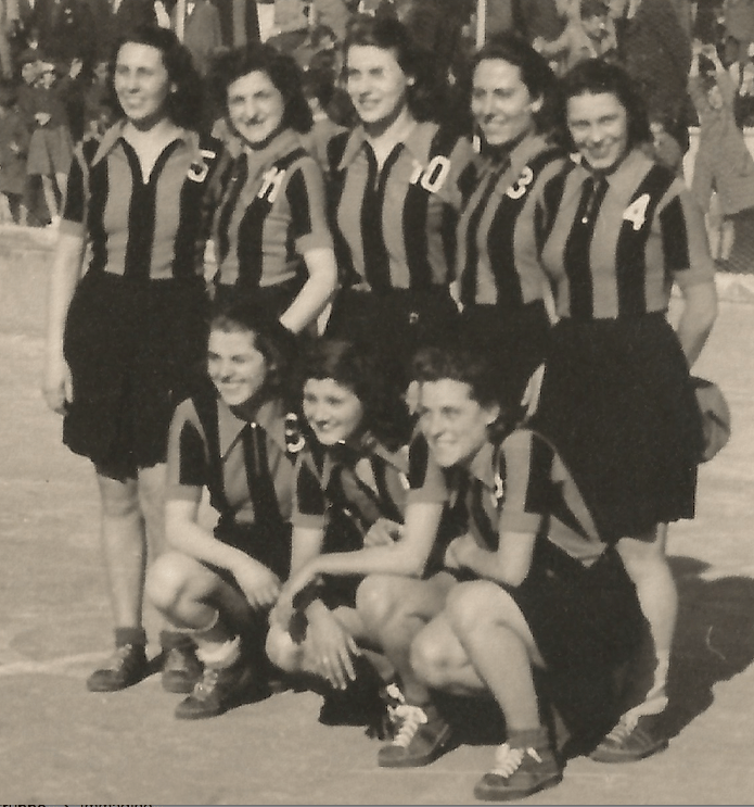 Nella foto, pubblicata dalla Gazzetta dello Sport, le 8 cestiste dell’Ambrosiana-Inter sorridono in occasione del loro secondo titolo nazionale: sul loro petto campeggiava già lo scudetto sabaudo con fascio littorio conquistato l’anno prima.