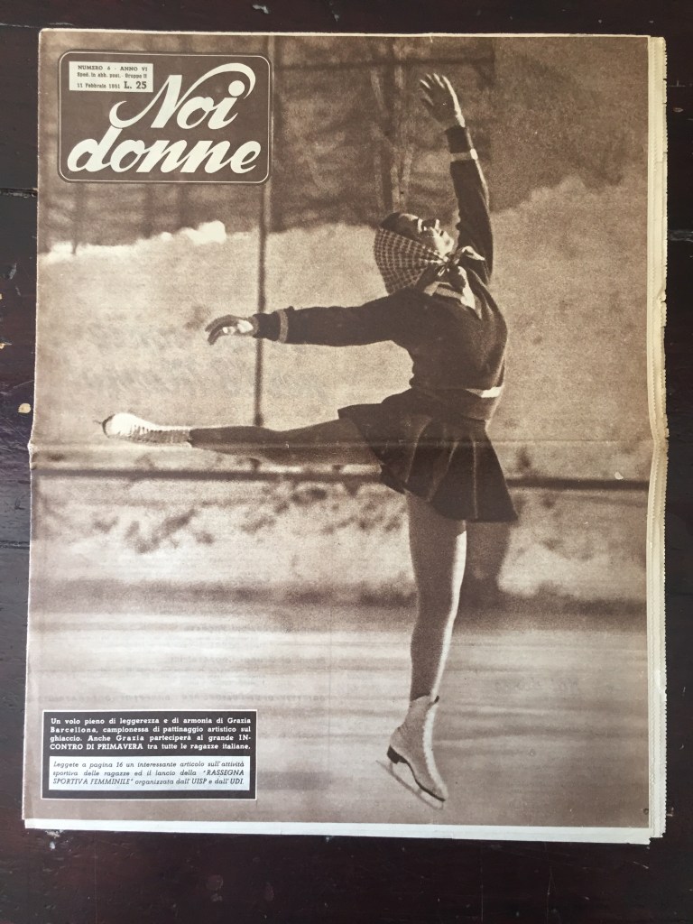 L’11 febbraio 1951 Noi Donne, settimanale dell’Unione Donne Italiane che vedeva sua madre Giovanna fra le dirigenti, dedica la copertina a Grazia, o meglio sfrutta l’immagine di Grazia pattinatrice per lanciare fra le proprie lettrici la Rassegna sportiva femminile (che si svolgerà poi effettivamente a luglio, a Roma):
