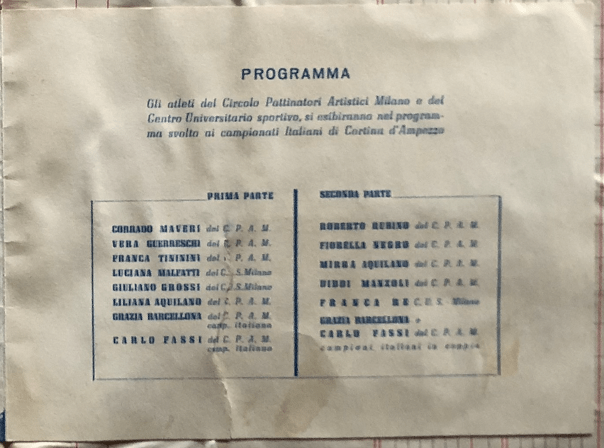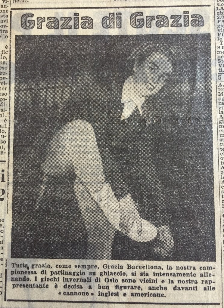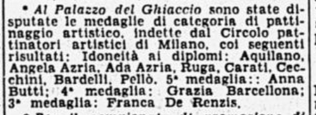 Domenica 19 gennaio 1947 si svolsero a Milano i Campionati Italiani di pattinaggio. Nella categoria seniores femminile le iscritte erano Fedora Nuremberg, Titi Azria, Grazia Barcellona e Costanza Vigorelli, tutte quante del Circolo Pattinatori Artistici Milano, che nel maschile schierava anche Fassi e De Mori – Grazia e Carlo erano iscritti anche alla gara di coppia. La Vigorelli vinse facilmente l’inviduale femminile. con p. 286,34, ma Grazia riuscì a conquistare un secondo posto (p. 230,70), con Fedora Nuremberg terza (p. 216,80) e Titti Azzia quarta (p. 215,08). Il trionfo di Grazia e Carletto nella gare in coppia (p. 9,36) fu scontato, essendo “l’unica coppia partecipante”! Da segnalare come la premiazione delle gare fosse svolta dal sindaco di Milano Antonio Greppi: non solo un collega ma anche un amico della mamma di Grazia, Giovanna Boccalini Barcellona.