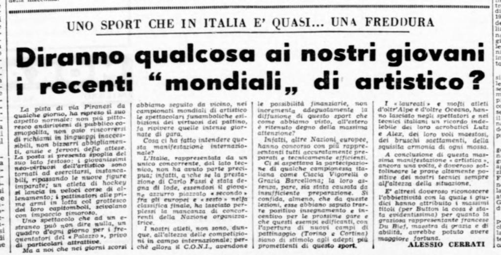 Finiti i Mondiali con la mediocre performance di Carlo Fassi, unico concorrente azzurro, Alessio Cerrati dalle colonne dell‘Avanti! i propri strali contro i dirigenti sportivi italiani, rei di presentato degni rappresentanti del paese ospitante la manifestazione:
