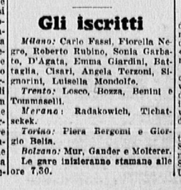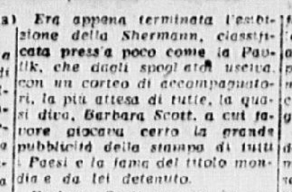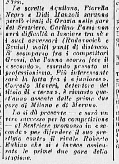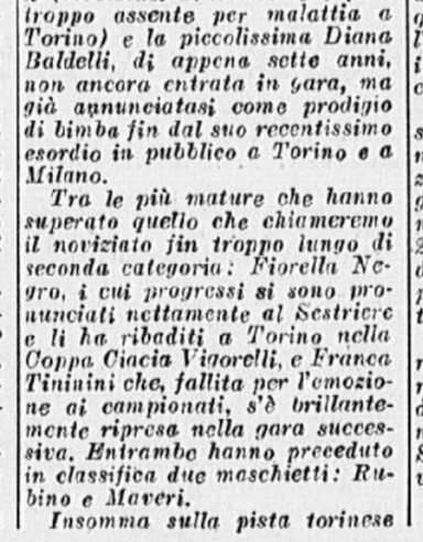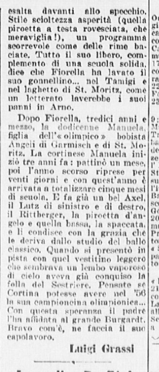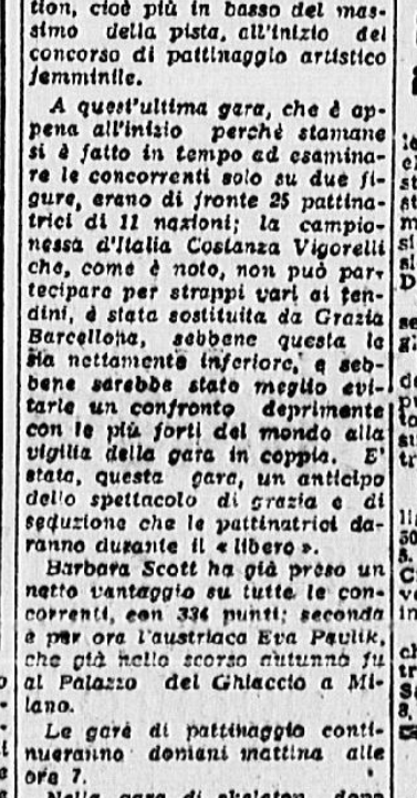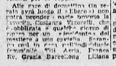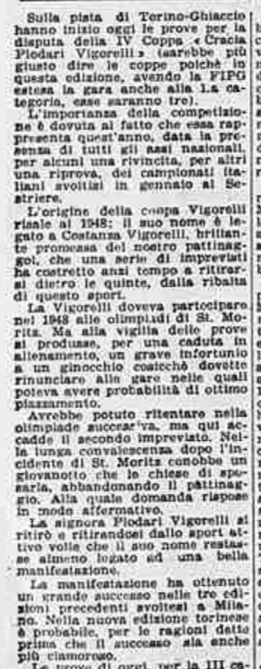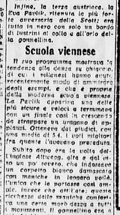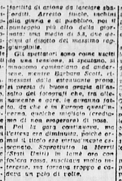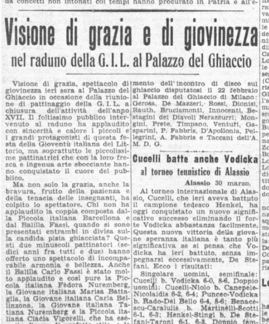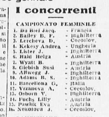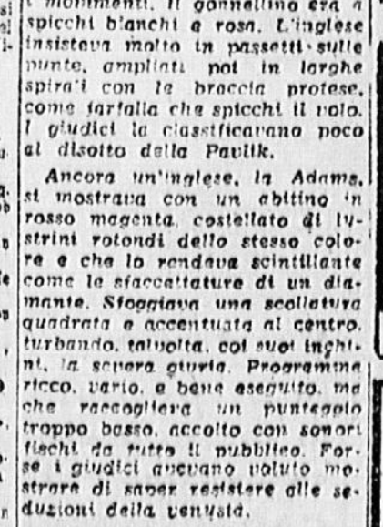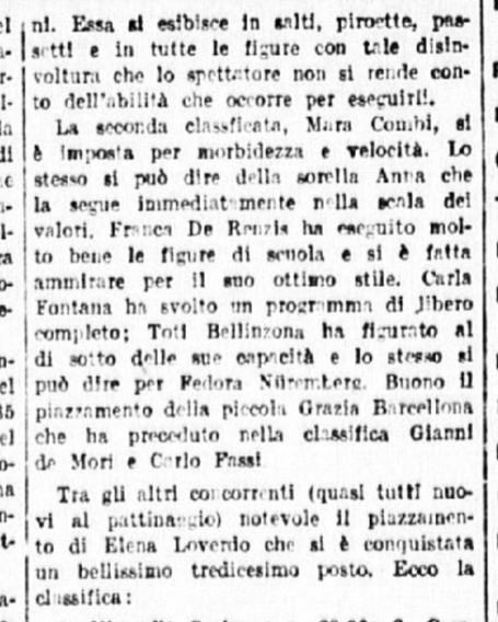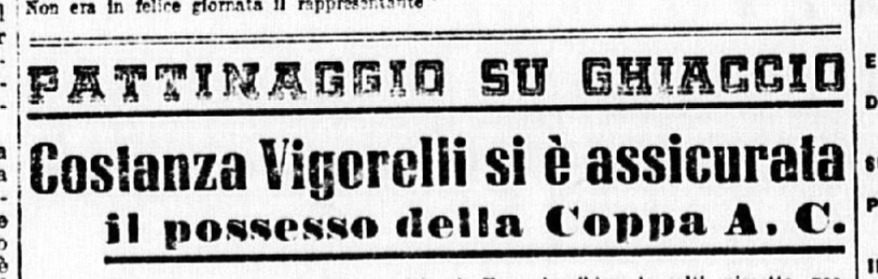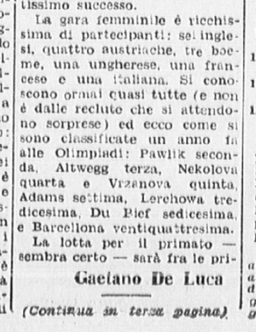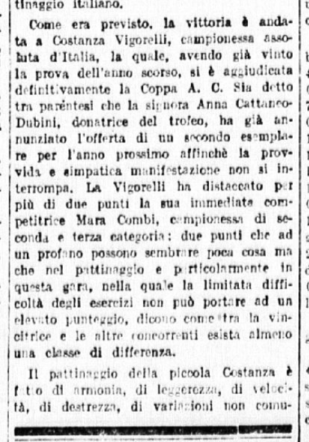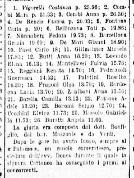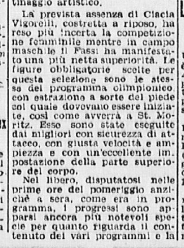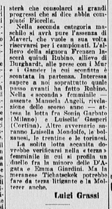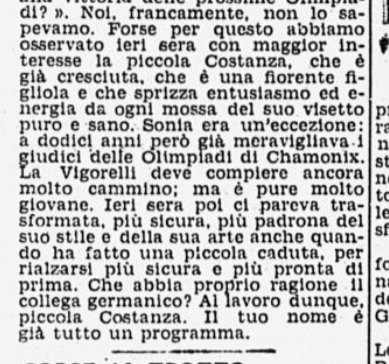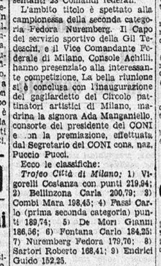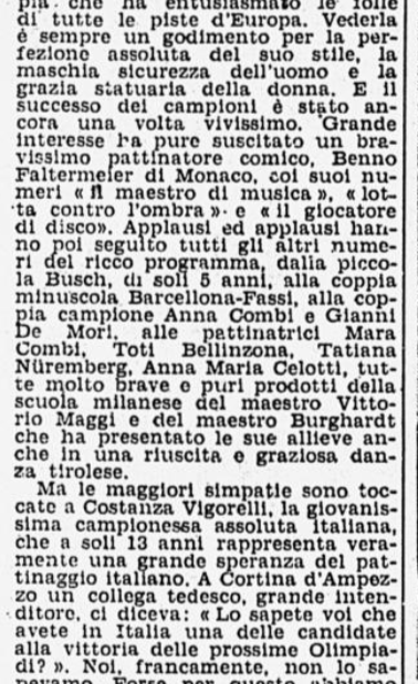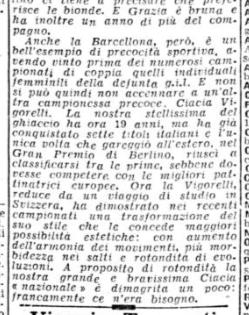 In conclusione, il giornalista parla anche di Costanza Vigorelli, tornata dimagrita da un “viaggio di studio in Svizzera”, e ormai indirizzata sul cammino della gloria, come dimostrato dai risultati di una precedente trasferta berlinese e dai suoi 7 titoli nazionali.