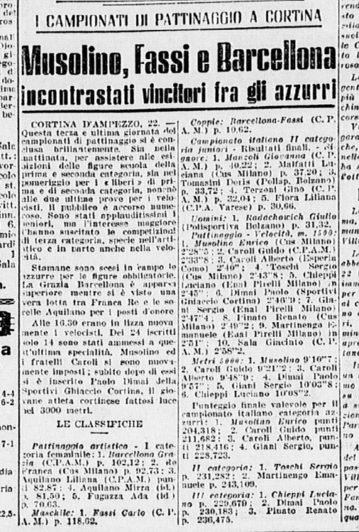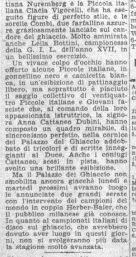 Anna Cattaneo Dubini (che poi avrebbe fatto un’esibizione assieme al marito) condusse poi 24 Piccole e Giovani Italiane in un esercizio collettivo a 24: “hanno composto un quadro mirabile, di sincronismo perfetto, nella cornice del Palazzo del Ghiaccio addobbato di tricolori e di scritte inneggianti al Duce”