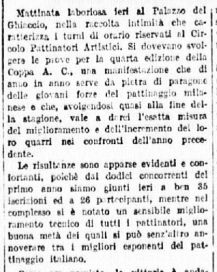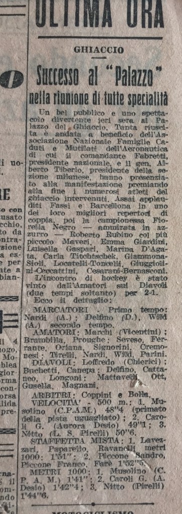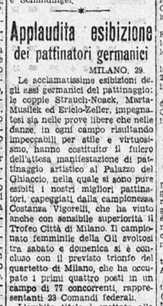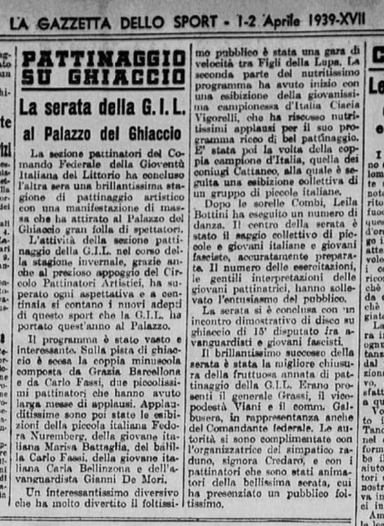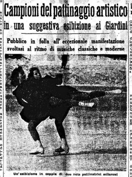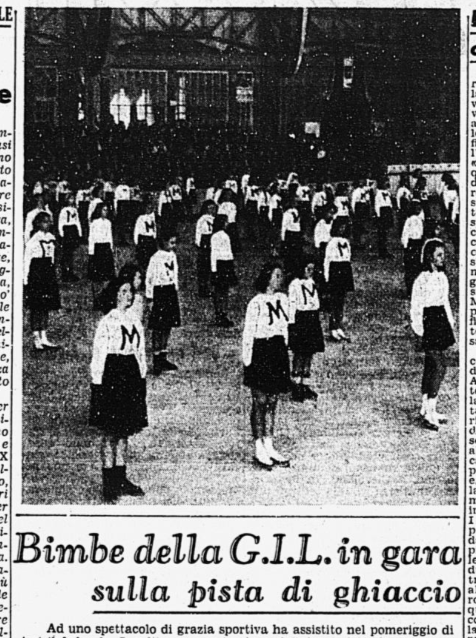Il 30 marzo 1939 c’è una “riunione di pattinaggio” della Gioventù Italiana del Littorio (GIL) milanese, a chiusura dell’anno dell’Era Fascista XVII (1938/1939). Il pubblico milanese rimase incantato dalle