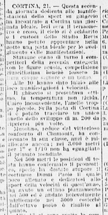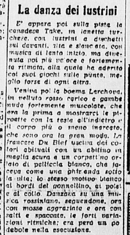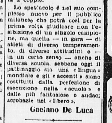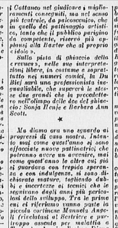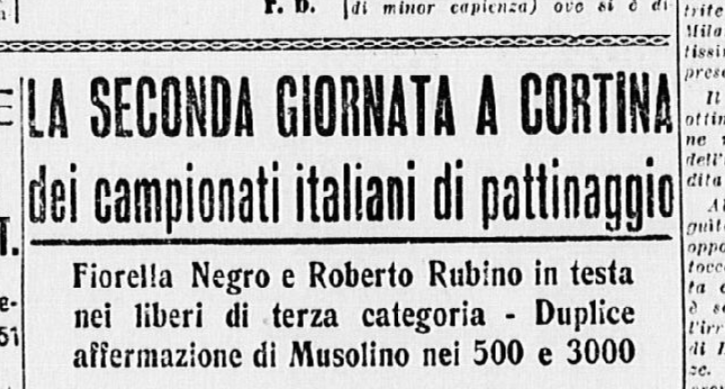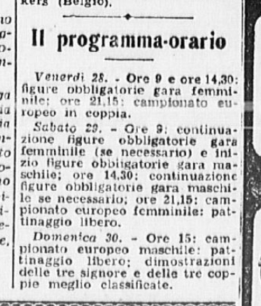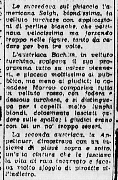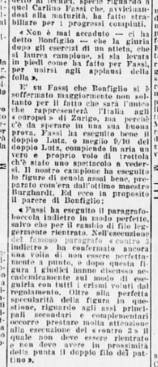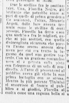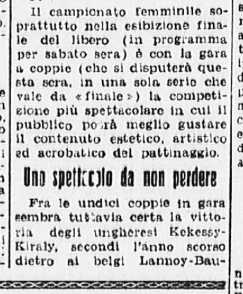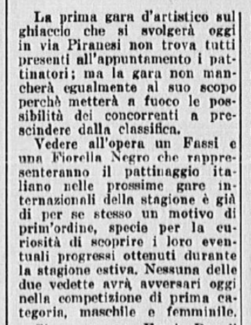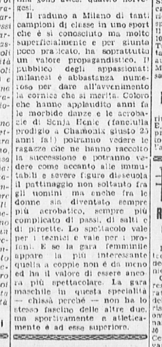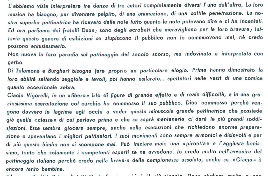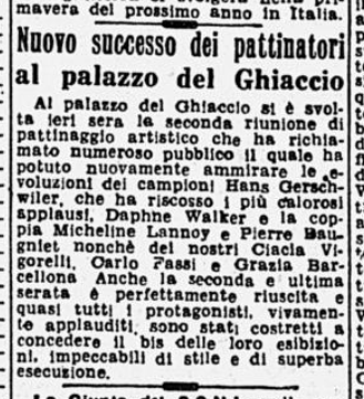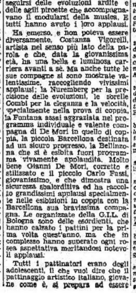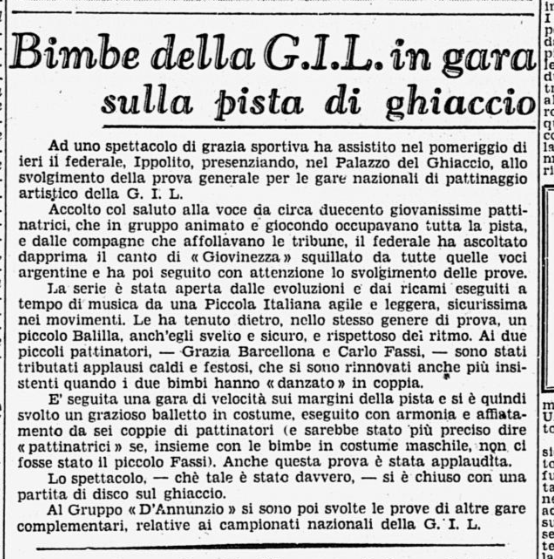La serie è stata aperta dalle evoluzioni e dai ricami eseguiti a tempo di musica da una Piccola Italiana agile e leggera, sicurissima nei movimenti. Le ha tenuto dietro, nello stesso genere di prova, un piccolo Balilla, anch’egli svelto e sicuro, e rispettoso del ritmo. Ai due piccoli pattinatori – Grazia Barcellona e Carlo Fassi – sono stati tributati applausi caldi e festosi, che si sono rinnovati anche più insistenti quando i due bimbi hanno “danzato” in coppia.