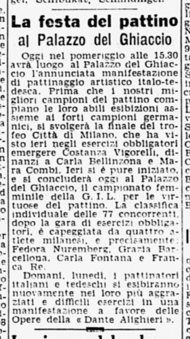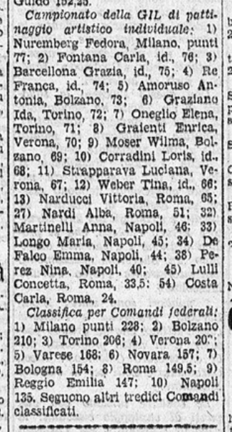 Domenica 29 marzo 1942 il Palazzo del Ghiaccio di Milano ospitò ben tre eventi: prima di tutto alcune esibizioni di coppie di pattinatori tedeschi (Strauch – Noack, Marta – Musilek, Ericlo – Zeller); poi il Trofeo Città di Milano, vinto con “con sensibile superiorità” da Costanza Vigorelli; infine, il Campionato femminile della GIL “per le virtuose del pattino”. Quest’ultimo (incominciato già sabato 28) “si è concluso con il previsto trionfo del quartetto di Milano, che ha occupato i primi quattro posti in un campo di 77 concorrenti, rappresentanti 23 Comandi federali”. La prima classificata fu in effetti la “campionessa della seconda categoria Fedora Nuremberg”, con 77 punti, seguita dalle sue tre compagne di squadra Carla Fontana (p. 76), Grazia Barcellona (p. 75) e Franca Re (p. 74). Fra la autorità, il capo sportivo della GIL Tedeschi, il Vice-Federale di Milano Achilli. Alla fine della manifestazione, la signora Ada Manganiello (moglie del Presidente del CONI) inaugurò il gagliardetto del Circolo Pattinatori Artistici di Milano, mentre la premiazione fu guidata dal Segretario del CONI Puccio Pucci.
