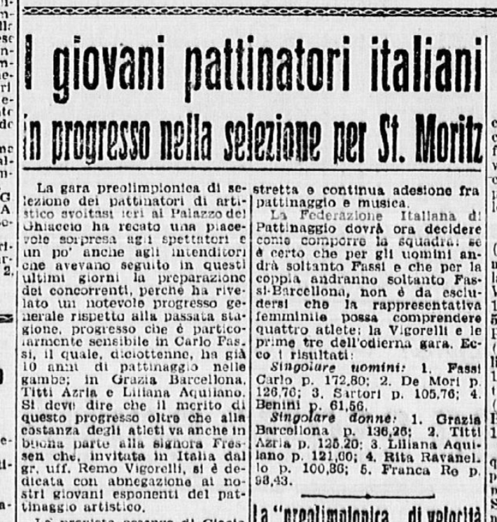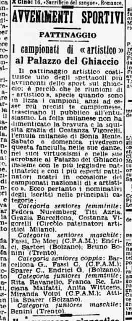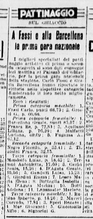 Nel febbraio 1946 si svolgono, al Palazzo del Ghiaccio di Milano, i Campionati nazionali di pattinaggio, vinti in campo maschile da Carlo Fassi, che sbaraglia Gianni De Mari e il bolzanino Sartori. In campo femminile il primo posto è per Costanza Vigorelli, seguita da Carla Bellinzona e quindi da Grazia Barcellona: