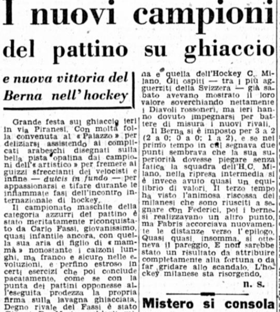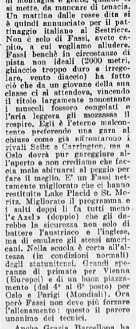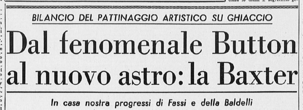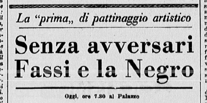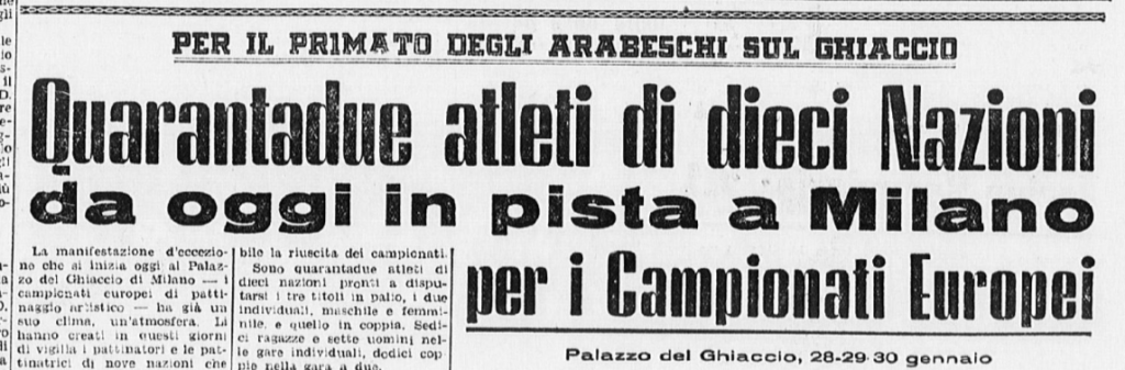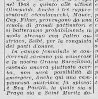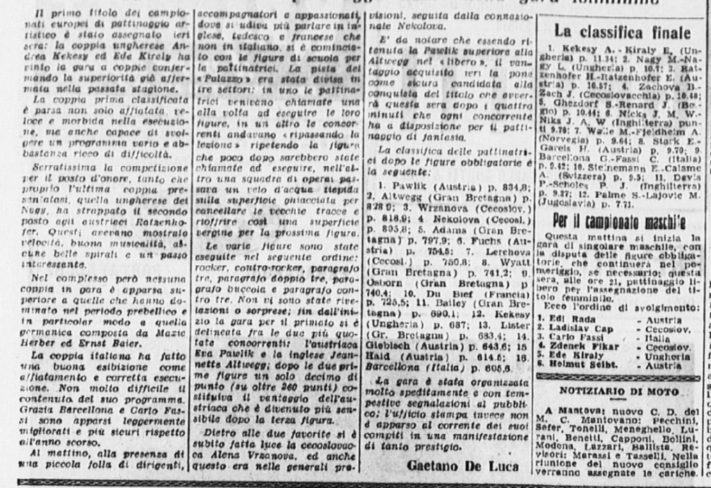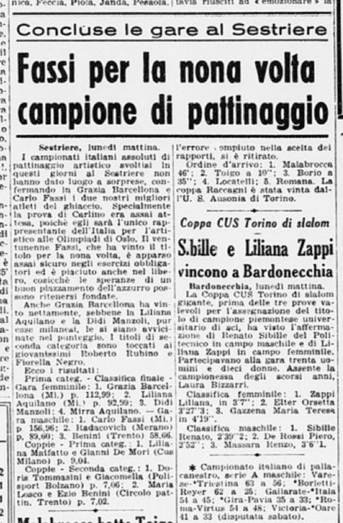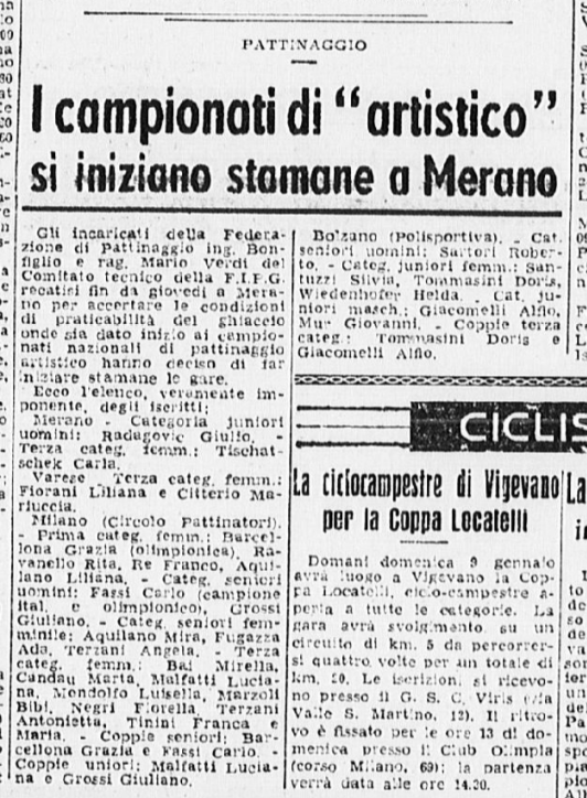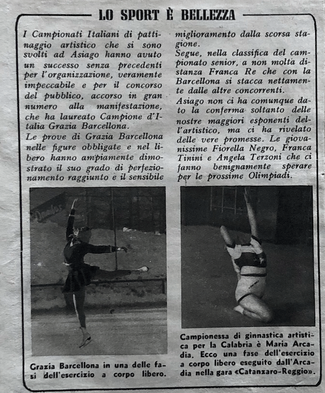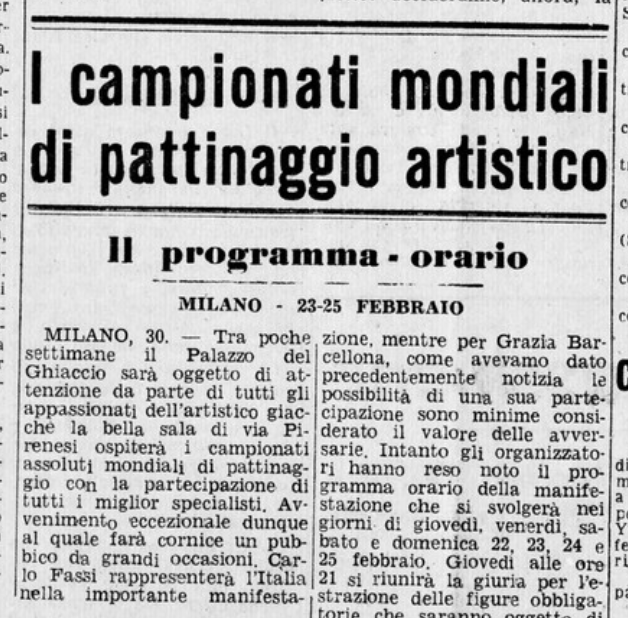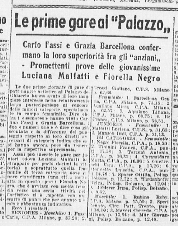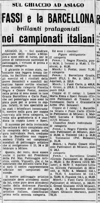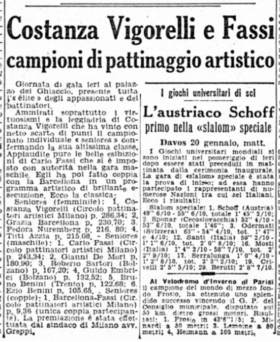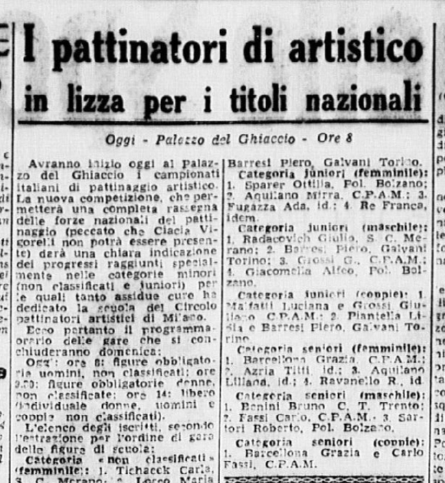 Il 18 gennaio 1954 si svolgono a Milano i Campionati nazionali di pattinaggio. Carlo Fassi vince sia nell’individuale maschile, sia in coppia con “la sempre elegante Grazia Barcellona” (p. 10,62), che a quanto risulta non gareggiò nell’individuale femminile, vinto da Fiorella Negro.
