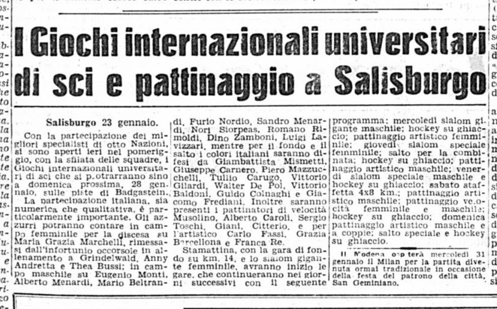 Subito dopo, a fine gennaio 1951 Carlo, Grazia e Franca Re vennero mandati a Bad Gastein, località sciistica vicina a Salisburgo (Austria), per i Giochi Internazionali Universitari di sci e pattinaggio, allora organizzati dalla FISU. Il giornalista del Corriere della Sera sottolineava il fatto che “la partecipazione italiana, sia numerica che qualitativa, è particolarmente importante”.