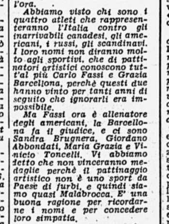 Parlando dei quattro rappresentanti azzurri ai Campionati Mondiali di Cortina 1963, ossia la 19enne Sandra Brugnera e il 15enne milanese Giordano Abbondati per il pattinaggio artistico, i coniugi Maria Grazia e Vinicio Toncelli per la danza, il giornalista del Corriere Paolo Bugialli ammette che i loro nomi “non diranno molti agli sportivi” d’Italia, i quali “di pattinatori artistici conoscono tutt’al più Carlo Fassi e Grazia Barcellona, perché questi due hanno vinto per tanti anni di seguito che ignorarli era impossibile. Ma Fassi ora è allenatore degli americani, la Barcellona fa il giudice” …
