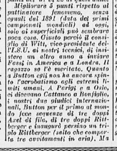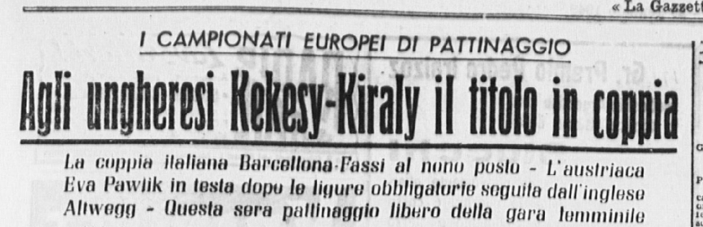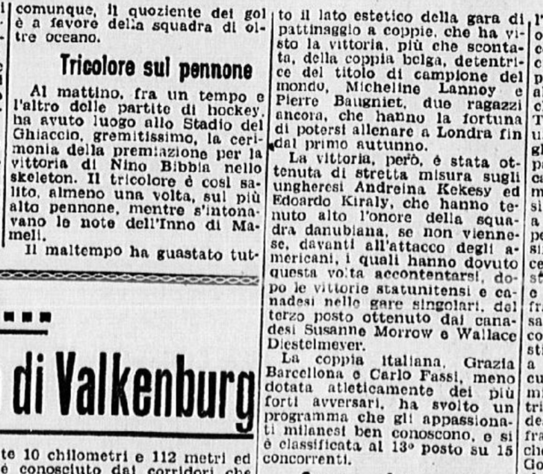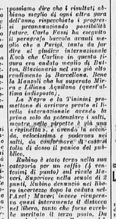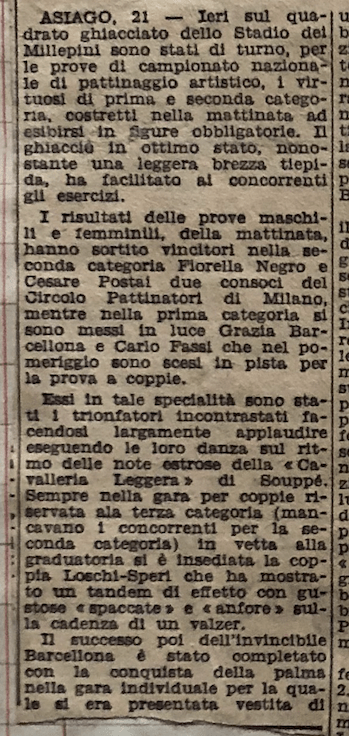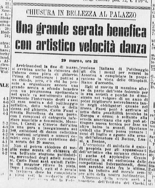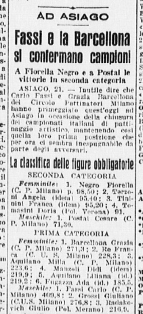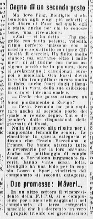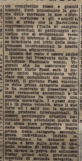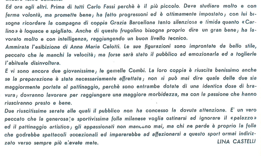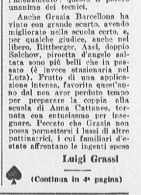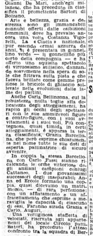 In coppia la stessa Barcellona con Carlo Fassi stanno ricalcando le orme vittoriose degli anziani campioni coniugi Cattaneo. I due giovanissimi successori degli inseparabili Anna ed Ercole formano una coppia, quasi dicevamo un matrimonio – di rara perfezione: con un affiatamento e un affratellamento che esprime a meraviglia le capacità di ciascuno di essi. Faranno strada, Grazia e Carlo. Auguri.