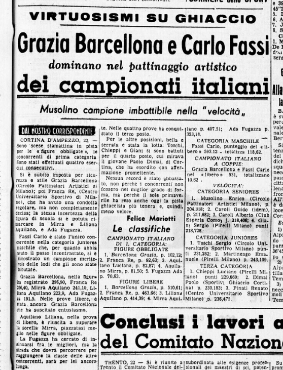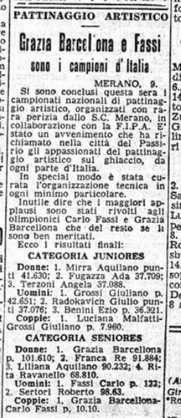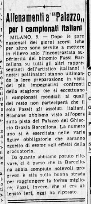 Il 30 e il 31 gennaio 1941 si disputarono a Milano (ovviamente al Palazzo del Ghiaccio) i Campionati nazionali di pattinaggio artistico. In prima categoria, vista l’assenza dei coniugi Cattaneo per motivi professionali, ci si aspettava nella coppia l’affermazione di Costanza Vigorelli, insidiata solo da Maria Combi (scontata la sua vittoria nella prova a coppie con Gianni De Mori). In seconda categoria, Anna Combi risultava alla vigilia l’unica iscritta, mentre “nel campionato coppie, Grazia Barcellona e Carlo Fassi daranno spettacolo del loro affiatamento e della loro valentia”. Su Neve e Ghiaccio Lina Castelli scrive:
