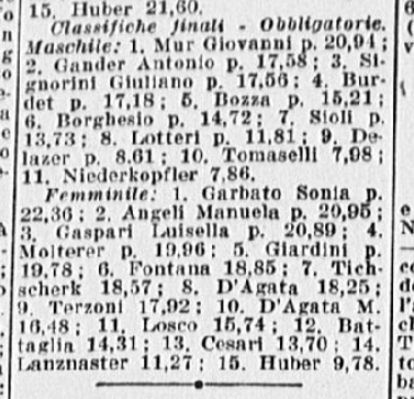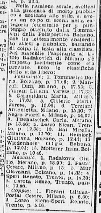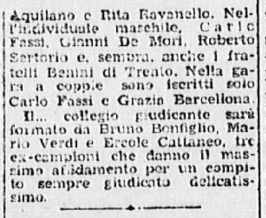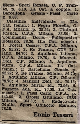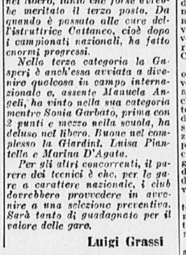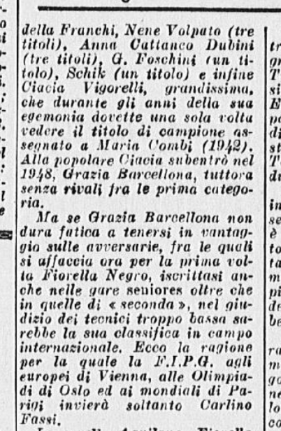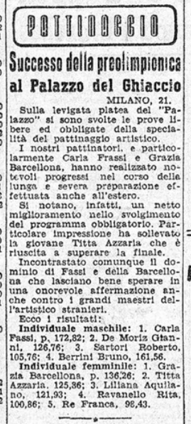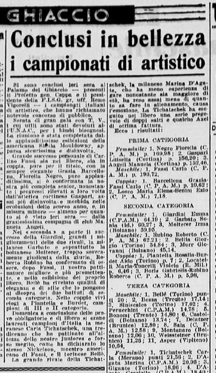 Sono proprio Grazia e Carlo (oltre alla “giovane Titta Azzaria”, refuso per Titti Azria ) ad essere lodati per i “notevoli progressi” realizzati “nel corso della lunga e severa preparazione effettuata anche all’estero”: “incontrastato comunque il dominio di Fassi e della Barcellona che lasciano bene sperare in una onorevole affermazione anche contro i grandi maestri dell’artistico stranieri”. Nel singolo femminile, Grazia vince con p. 136,26; seconda Titta Azzaria, p. 125,36; terza Liliana Aquilano, p. 121,93; quarta Rita Ravanello, p. 100,86; quinta Franca Re, p. 98,43.