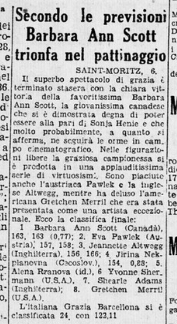 Il 6 febbraio 1948 si svolse la prova di libero dell’individuale femminile, vinta da Barbara Scott: Grazia arrivò penultima.