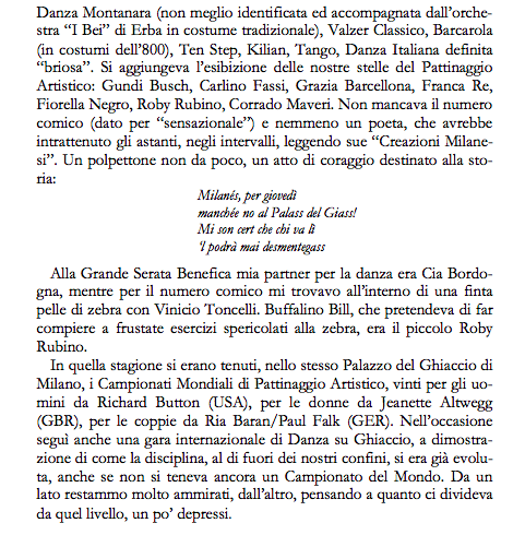 Harry Burghardt, il maestro dice che li ha portati dallo stato di passerotti di primo nido alla presente eccellenza, li guarda con compassata soddisfazione rimandando al giorno dopo gli ammonimenti e i consigli per affinarne sempre meglio lo stile. Mentre la signora Cattaneo che insieme al marito dirige tutta la covata del Circolo pattinatori artistici di cui è presidente il comm. Remo Vigorelli, li loda con materna tenerezza apostrofandoli con dei: stelle, stelloni, che schioccano come baci.