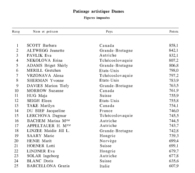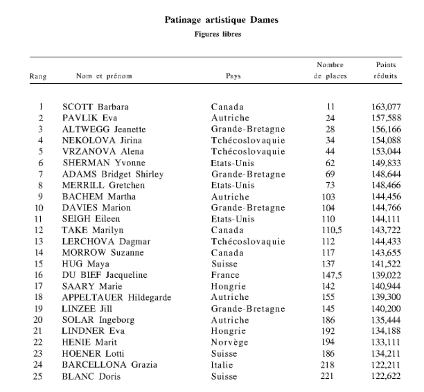 Si è subito imposta per sicurezza e stile Grazia Barcellona (Circolo Pattinatori Artistici di Milano); poi Franca Re (Centro Universitario Sportivo di Milano), che ha avuto una condotta regolare, ma non completamente decisa; la stessa incertezza della figura di scuola si è potuta rimarcare in Mirra e Liliana Aquilano, e Ada Fugazza