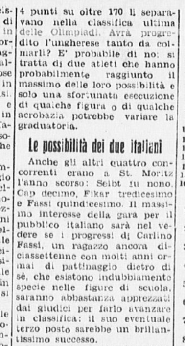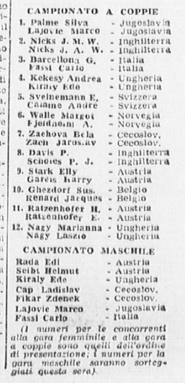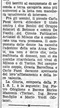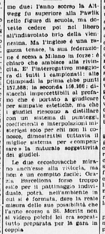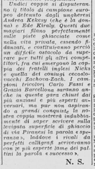 Qualche giorno prima dell’inizio dei campionati, un anonimo giornalista del Corriere della Sera non si fa molte illusioni sulle reali possibilità di medaglia di Carlo e di Grazia, sia nelle prove individuali sia in quelle di coppia:
