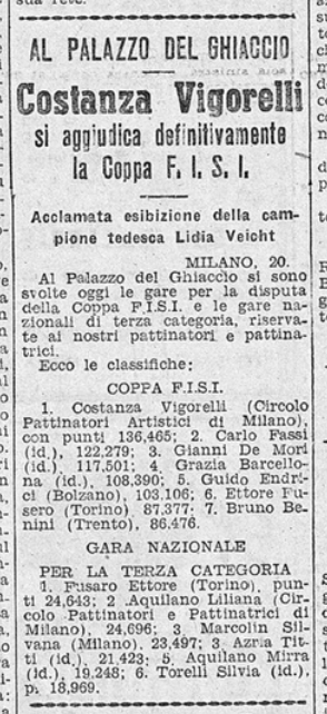 Nel dicembre 1942 si svolgono al Palazzo del Ghiaccio di Milano le gare per la disputa della Coppa FISI (nonché quelle nazionali di terza categoria, cui partecipano per il Circolo Pattinatori Artistici Liliana Aquilano, Silvana Marcolin, Titti Azria, Mirra Aquilano e Silvia Torelli). Costanza Vigorelli “si aggiudica definitivamente” la coppa con p. 136,465, secondo Carlo Fassi con p. 122,279; Grazia è quarta con p. 108,390.