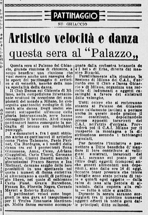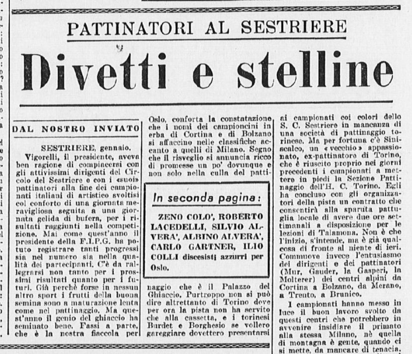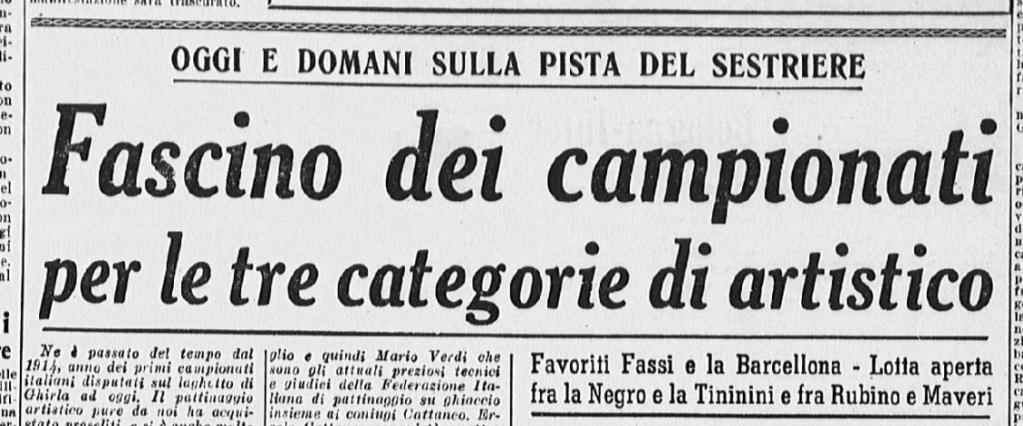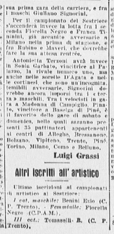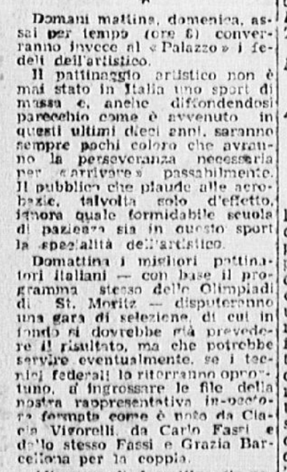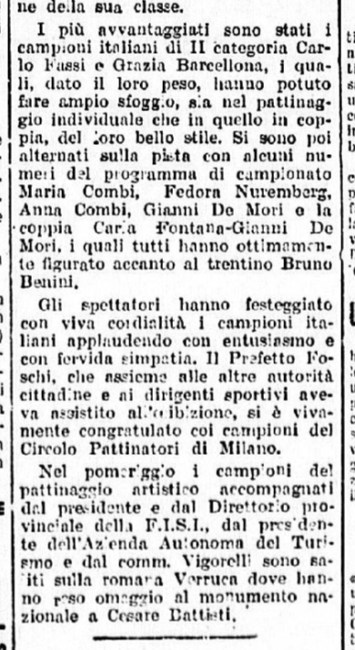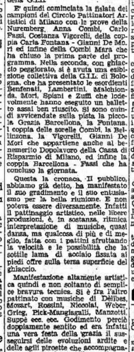 Finito il momento di Grazia e Carlino, la pista viene presa in consegna dagli altri pattinatori, protagonisti annunciati degli imminenti Campionati: “le gemelle Anna e Mara Combi, uguali nel dolce volto, nel grazioso costume, nello stile”; Toti Bellinzona (“un altro astro, un’altra minaccia per la conquista del secondo posto dopo l’imbattibile Ciacia); Carla Fontana, partener di pista di Gianni de Mori, che “improvvisa una gara di velocità con Roberto Sartori”. È poi il turno delle