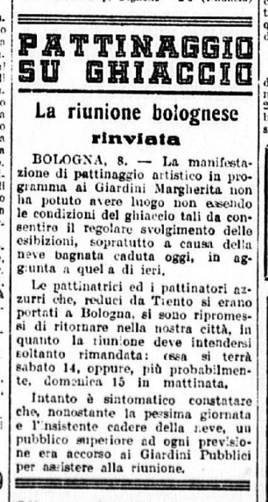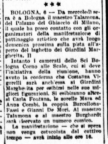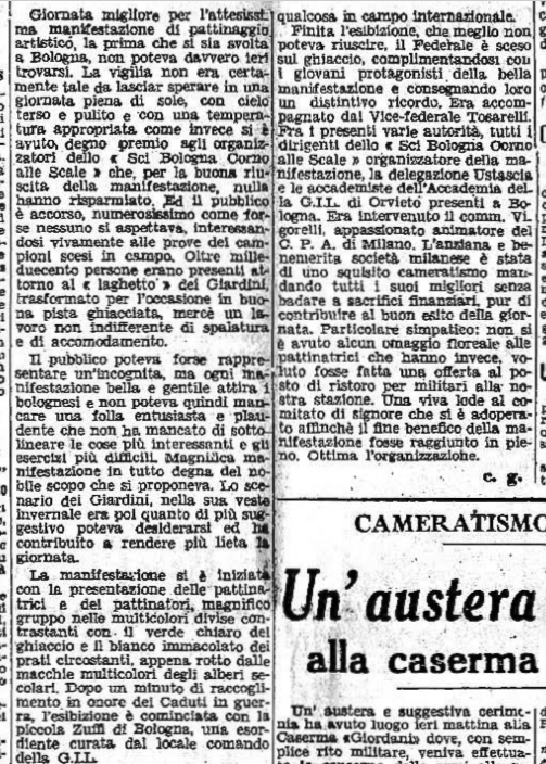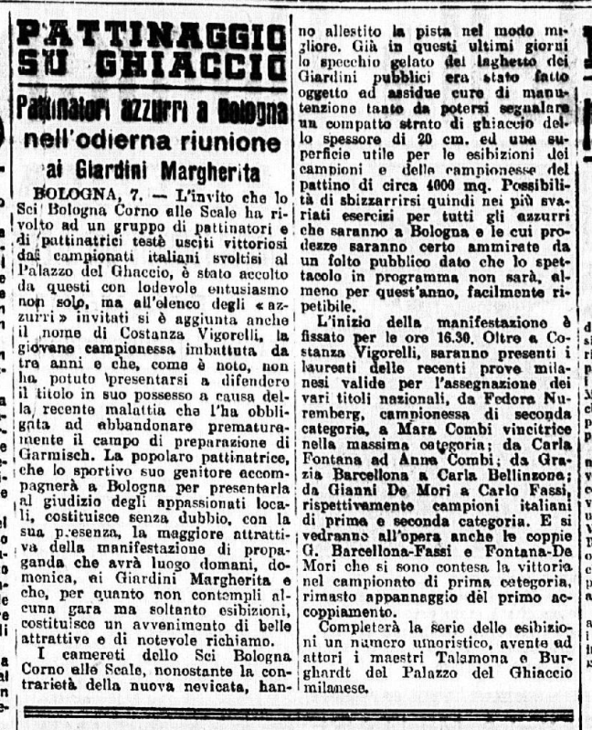 Domenica 15 febbraio 1942 un compagine di pattinatori e pattinatrici milanesi, guidati dal commendator Vigorelli (che ci mise del suo, dal punto di vista economico, per rendere possibile la trasferta), sbarca a Bologna, per una esibizione pubblica outdoor, ai Giardini cittadini. La giornata di propaganda sportiva, organizzata dallo Sci Bologna Corno alle Scale, e fu un grande successo, visto l’enorme afflusso di pubblico: 1200 spettatori, assiepati attorno al laghetto interno ai Giardini. La manifestazione iniziò con la presentazione di pattinatrici e pattinatori, “magnifico gruppo nelle multicolori divise”, che venne seguita da “un minuto di raccoglimento in onore dei Caduti in guerra”. La prima ad esibirsi fu “la piccola Zuffi di Bologna, una esordiente curata dal locale comando della GIL”. Il Circolo Pattinatori Artistici di Milano fece quindi esibire la Nuremberg, Anna Combi, Carlo Fassi, Costanza Vigorelli, la coppia Carla Fontana – Gianni de Mori. La seconda parte della manifestazione vide una una esibizione collettiva delle pattinatrici della GIL di Bologna: fu quindi il turno di Grazia Barcellona, dopo cui vennero la Fontana, le sorelle Combi, la Bellinzona, Costanza Vigorelli, Gianni de Mori, “ed infine la coppia Barcellona – Fassi che ha concluso la giornata”. Lodata sopra tutte Costanza Vigorelli, c’era spazio anche per “la piccola Barcellona, destinata ad un sicuro progresso” e per “il piccolo Carlo Fassi, giovanissimo, e che dimostra una sicurezza sbalorditiva ed ha raccolto grandissimi applausi specialmente nelle esibizioni in coppia con la Barcellona sua bravissima compagna”. Fra il pubblico, oltre al Federale di Bologna (che regalò ai pattinatori, tutti adolescenti, “un distintivo ricordo), vanno segnalati perlomeno “la delegazione Ustascia” (si ricordi che in quel momento la Croazia era occupata dalle forze nazifasciste) e “le accademiste dell’Accademia della GIL di Orvieto presenti a Bologna”. Alla fine le pattinatrici, non ricevendo alcun omaggio floreale, chiesero piuttosto che “fosse fatta una offerta al posto di ristoro per militari alla nostra stazione”