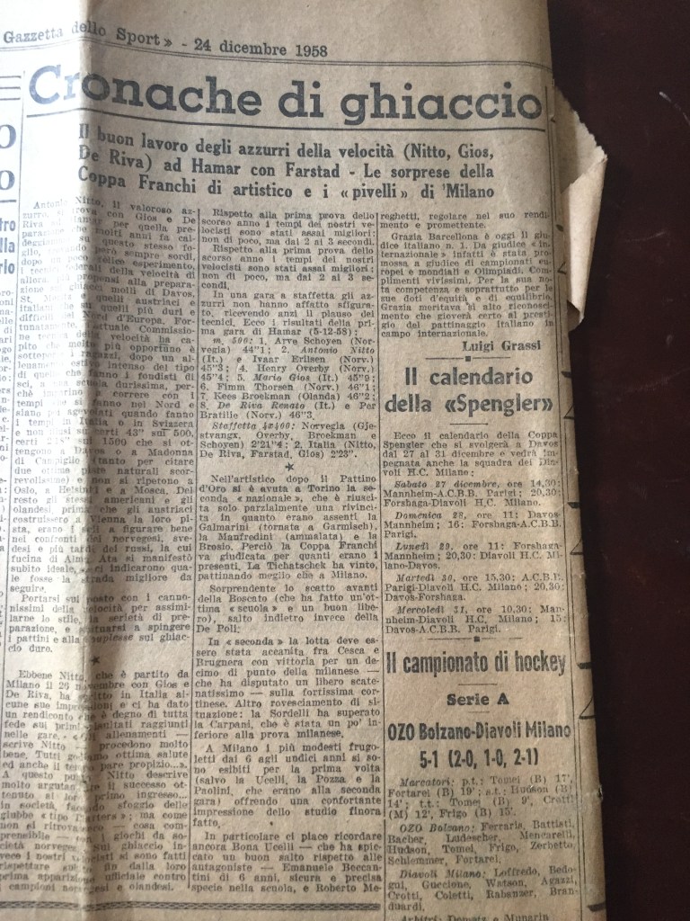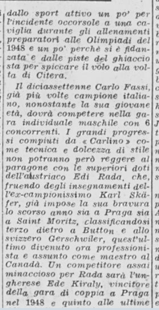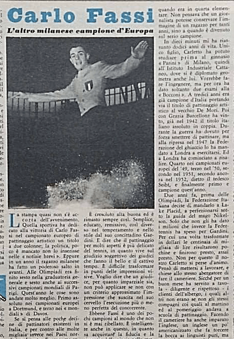 Nell’aprile 1953 Natale Bertocco (sotto lo pseudonimo di Papà Natale) firma un articolo su Carlo Fassi per Il Vittorioso, nato evidentemente da un’intervista con lo stesso (fatta di capisce un mese prima, quindi nel marzo 1953), che è molto utile per la biografia del pattinatore. Sottolineando l’evidente salto in avanti di Carlino (solo sesto alle Olimpiadi di Oslo 52, e improvvisamente primo agli Europei di Dortmund 53) Bertocco esalta il fatto che, al netto delle “poche decine di pattinatori esistenti in Italia”, Carlo abbia dato