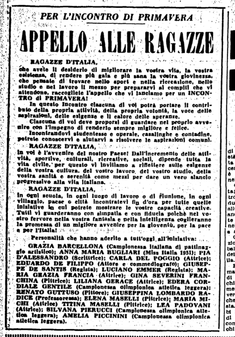 Nel giugno 1951 Grazia, “campionessa italiana di pattinaggio artistico”, è la prima firmataria (come aderente, non come autrice) dell’Appello alle ragazze, pubblicato da L’Unità – per altro, una delle poche sportive, assieme ad Edera Cordiale Gentile (atleta, vincitrice di un argento olimpico a Londra 1948), Silvana Pierucci (atleta, non fu campionessa olimpionica come scritto nell’appello: partecipò da campionessa italiana a Londra 1948, arrivando però solo 14esima nel salto in lungo) e Amelia Piccinini (atleta, vincitrice di un argento olimpico a Londra 1948). Il testo voleva pubblicizzare l’Incontro di Primavera, manifestazione sportiva organizzata dall’UISP.