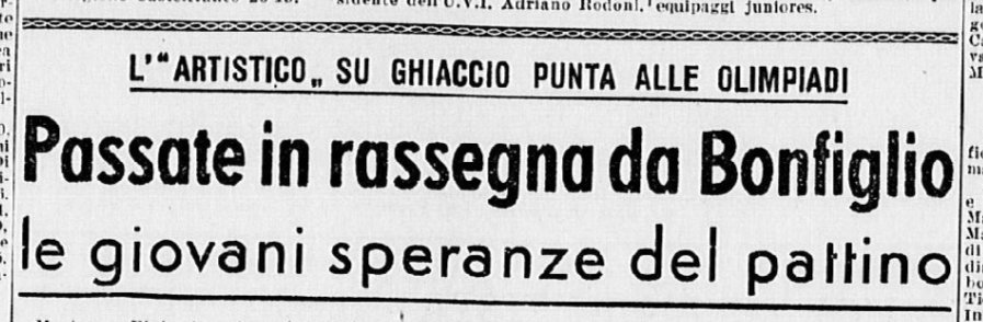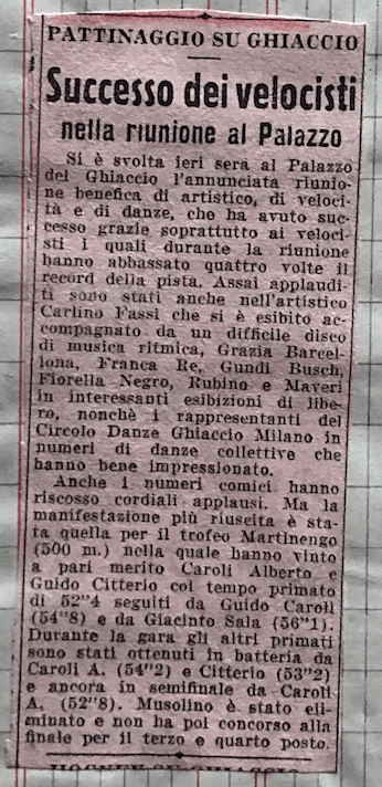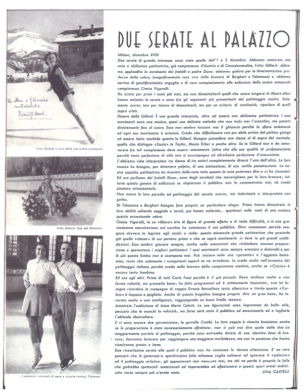 Il 17 gennaio 1942 un articolo de La Sera presenta i Campionati italiani di pattinaggio artistico, previsti fra il 30 gennaio e il 1° febbraio 1942. L’inviato “Bis” descrive un gruppo di assi (assente però la “stellona” Ciacia Vigorelli, in trasferta in Germania) tutti intenti ad allenarsi al Palazzo del Ghiaccio, e ormai abbastanza svezzati da poter essere definiti “un piccolo firmamento di eccellenti virtuosi”. Per puro caso, il giornalista assiste proprio all’allenamento di Grazia e di Carlino: