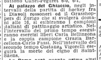 Il 16 marzo 1946 alcuni pattinatori milanesi si esibirono al Palazzo del Ghiaccio durante i due intervalli della partita di hockey su ghiaccio Diavoli – Grasshoppers Zurigo: durante il primo, Carla Bellinzona e “la coppia campione Grazia Barcellona – Carlo Fassi”, durante il secondo Costanza Vigorelli.