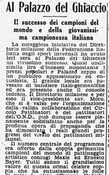 Il 12 febbraio 1941 il Palazzo del Ghiaccio ospitò i due grandi campioni di coppia tedeschi Maxie Herber ed Ernst Baier. A far loro da corona, molti giovani pattinatori milanesi, fra cui “la coppia minuscola Barcellona-Fassi”: