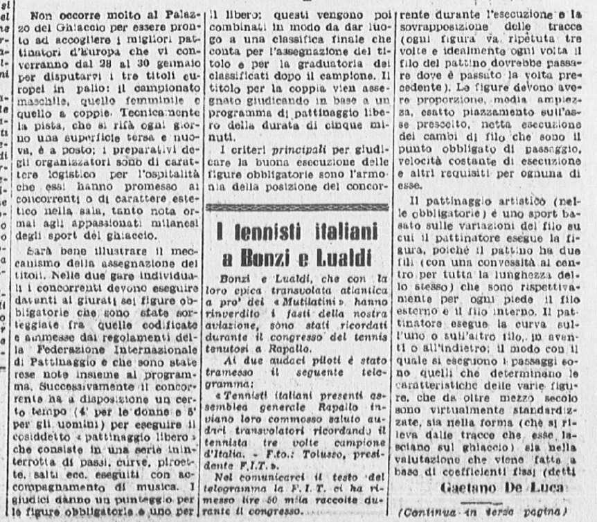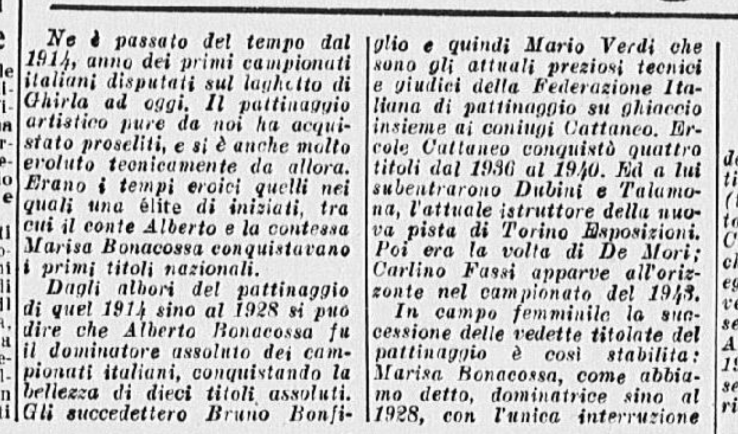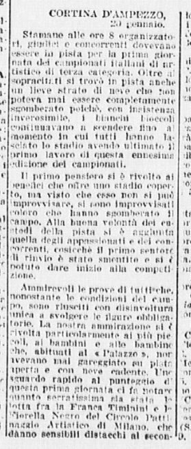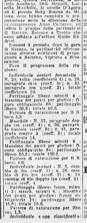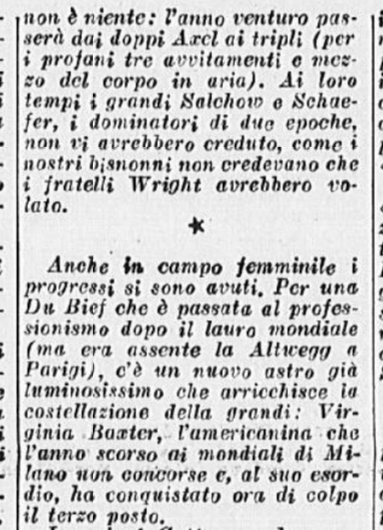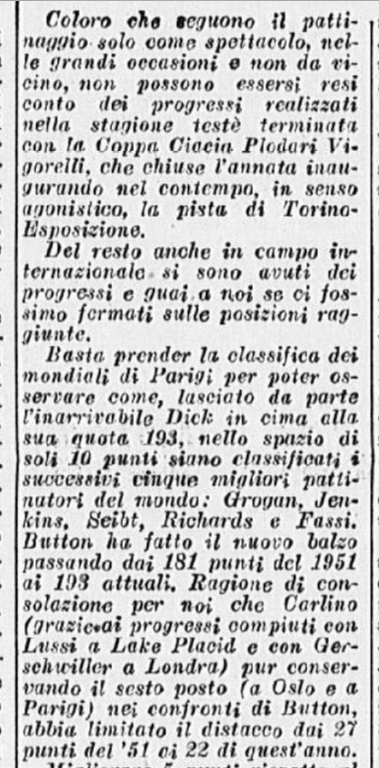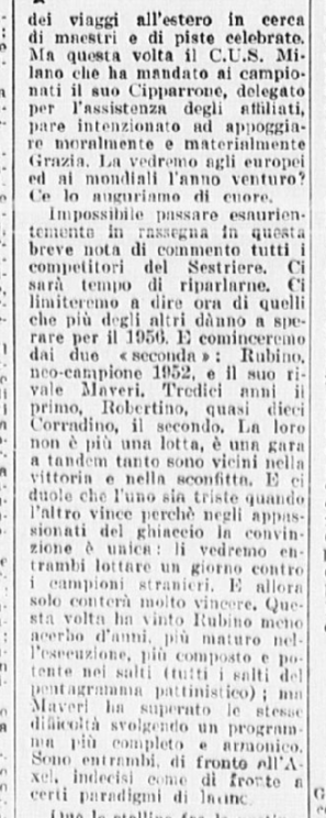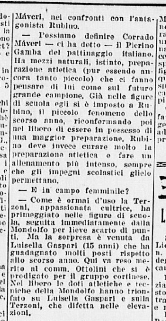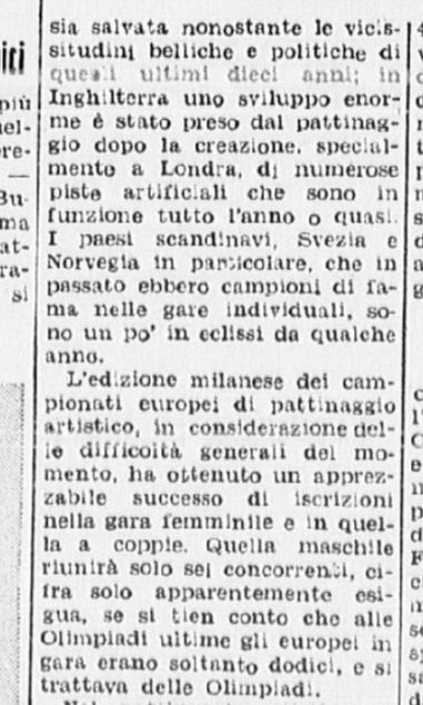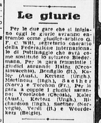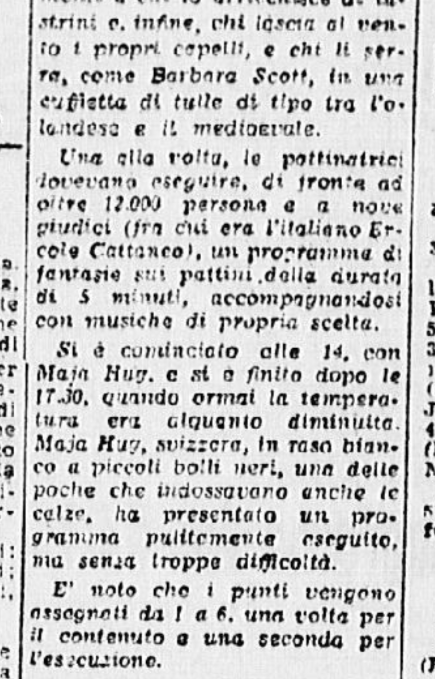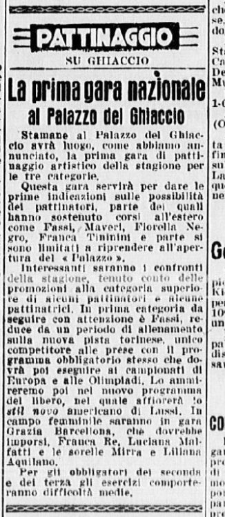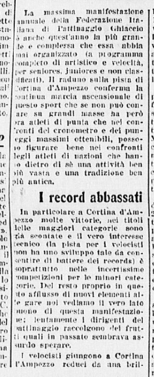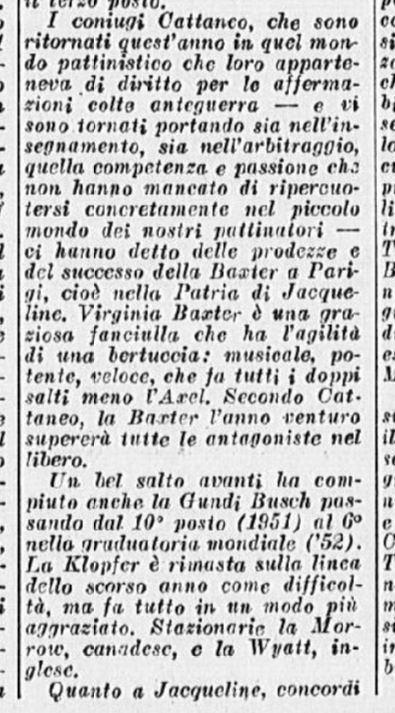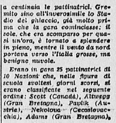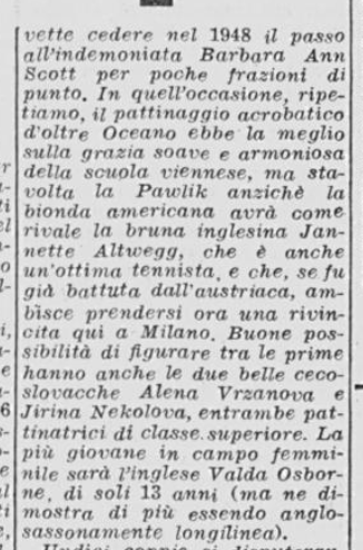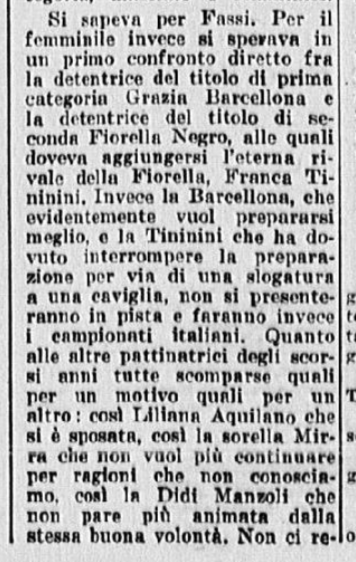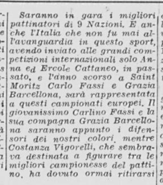 Ci si aspettava la partecipazione di qualche campionessa italiana come Ciacia Vigorelli o Grazia Barcellona; la loro assenza, pare, sia stata causata da insufficiente preparazione. Si confida, almeno che da queste lezioni esse abbiano saputo trarre positivo insegnamento e incentivo per le prossime gare e che questi esempi edificanti, con l’apertura di nuovi campi di pattinaggio (Torino e Cortina) siano di stimolo agli adepti più promettenti di questo sport.