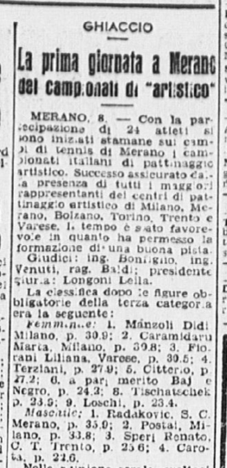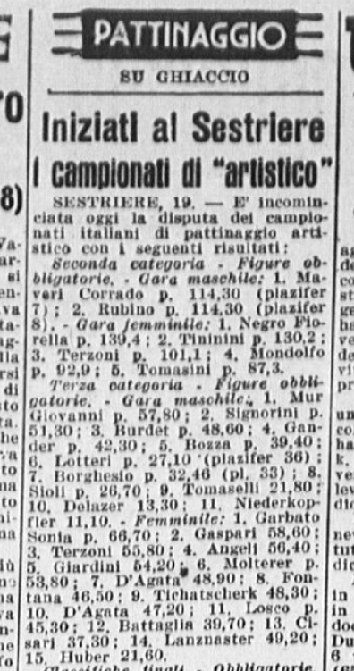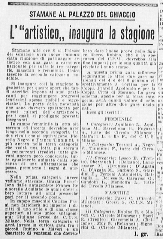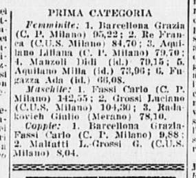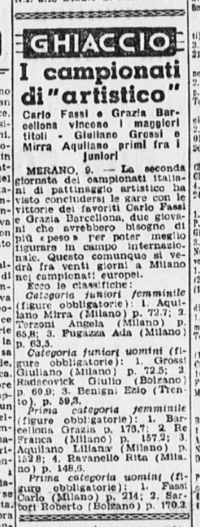 Quelli di prima categoria vengono vinti già in mattinata da Grazia (singolo femminile) e Carlo (singolo maschile), “che nel pomeriggio sono scesi in pista pure per le prove in coppia. Infatti, in tale specialità sono stati i trionfatori incontrastati”. Nelle figure obbligatorie Grazia vince con p. 271,3; seconda Franca Re, p. 228,3; terza Aquilano, p. 223,6. Nella classifica individuale femminile (vinta per la II categoria dalla dodicenne Fiorella Negro) Grazia è prima con p. 95,22; seconda Franca Re (CUS Milano), p. 84,70; terza Liliana Aquilano (Circolo Pattinatori Artistici, Milano), p. 79,70; quarta Manzoli (Circolo Pattinatori Artistici, Milano), p. 79,15; quinta Mirra Aquilano (Circolo Pattinatori Artistici, Milano), p. 72,96; sesta Fugazza (Circolo Pattinatori Artistici, Milano), p. 66,08. Il giornalista del Corriere dello Sport aggiunge: