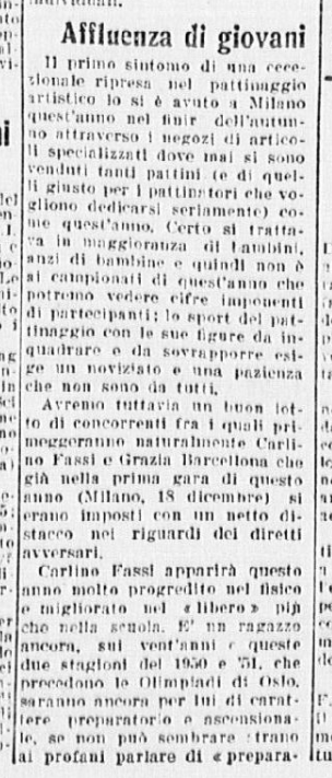 Il 17 dicembre 1950 si svolsero a Milano le gare nazionali che diedero via alla stagione sportiva 1950/1951. Carlo Fassi e Grazia Barcellona vinsero rispettivamente l’individuale maschile, e quello femminile: