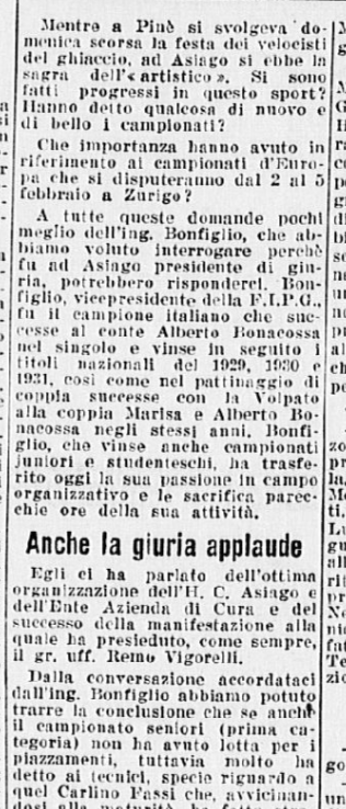 Dopo i Campionati di Asiago, l’ing. Bonfiglio rilasciò un’interessante intervista a Luigi Grassi, nella quale faceva il punto della situazione di quanto aveva potuto vedere, come presidente di giuria: