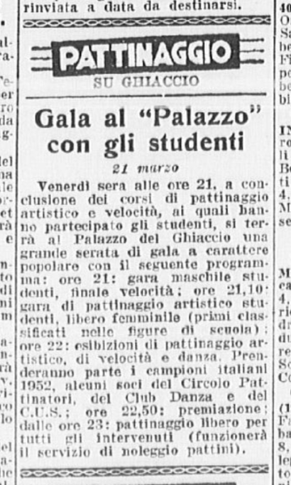 Il 21 marzo 1952 una serie di pattinatori si esibì di fronte agli studenti dei corsi di pattinaggio artistico e di velocità: Carlo Fassi, Fiorella Negro, Grazia Barcellona, Franca Re, Mirra Aquilano, Robi Rubino.