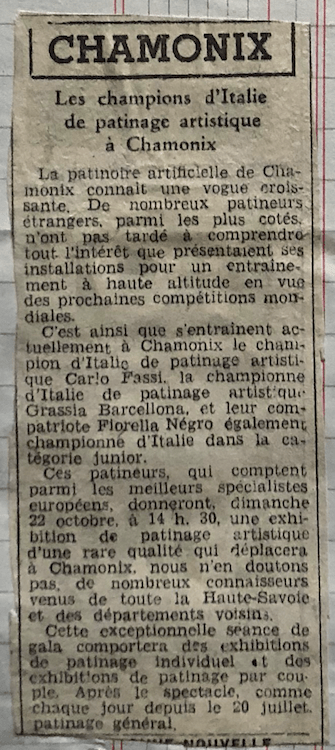 Il 21 ottobre 1950 Carlo Fassi, Grazia Barcellona e Fiorella Negro, che già si trovavano a Chamonix per allenarsi, fecero un’esibizione pubblica: