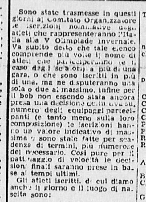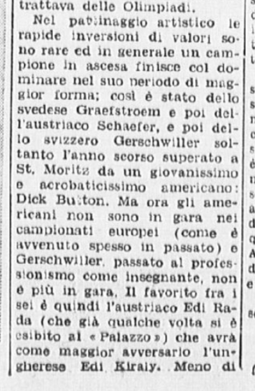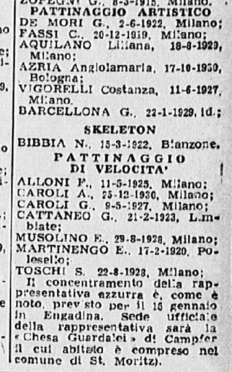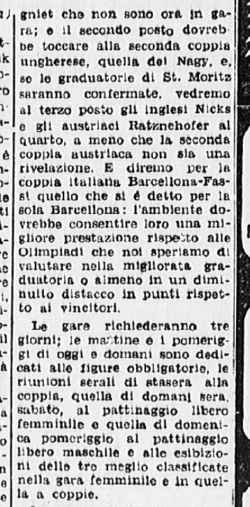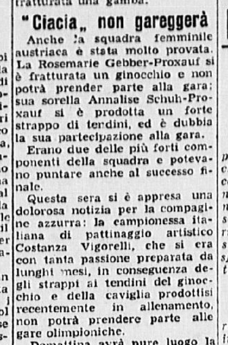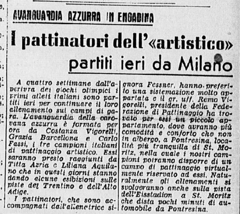 La stampa raccontò qualcosa degli allenamenti dei pattinatori, in ritiro nella vicina Pontresina, e soprattutto il dramma di Ciacia Vigorelli, che la sera del 30 gennaio venne ufficialmente esclusa dai gareggianti, causa un infortunio non recuperato in tempo: