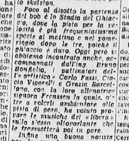 Nella pagina nel Vittorioso è presente un articolo sul tennista milanese Fausto Gardini, criticato per gli scadenti risultati al netto degli investimenti fatti su di lui (venne mandato dalla Federazione ad allenarsi negli USA, sotto la guida di Mark Tennant): a questi Bertocco oppone il coetaneo Fassi. Il ritratto semi-agiografico tocca il vertice quando il giornalista ricorda la letterina ricevuta da Carlino nel 1940, vergata sul quaderno di quarta elementare, in cui il pattinatore, allegando una sua foto, avrebbe scritto: “Se i giornalisti mi aiutano e se anche lei dirà qualcosa di me alla radio, diventerò anch’io un campione”.