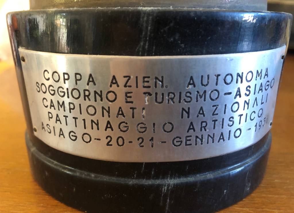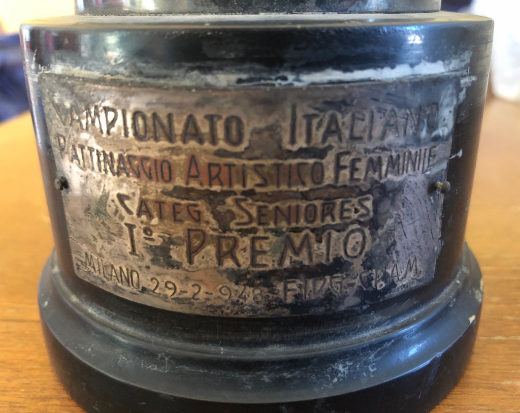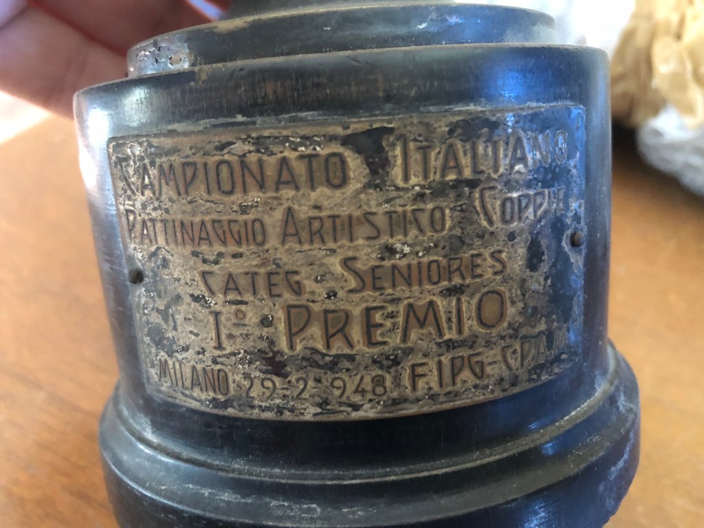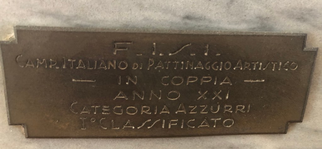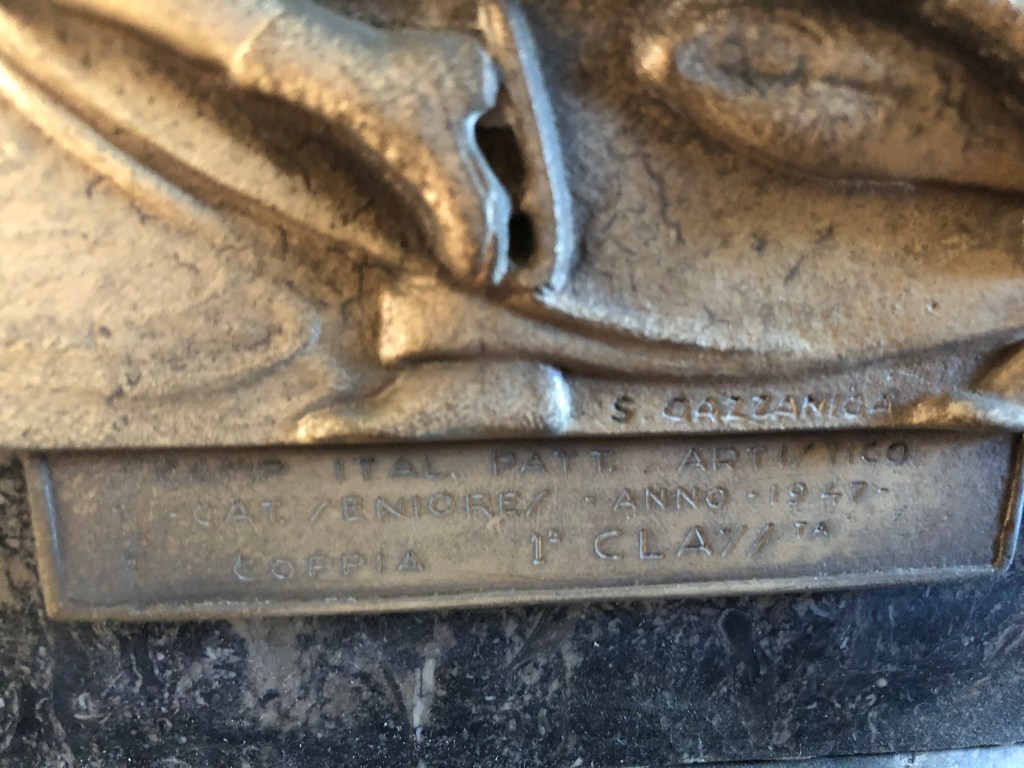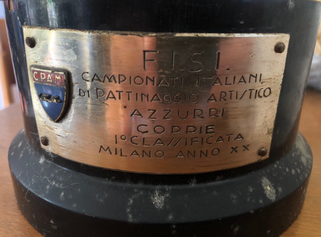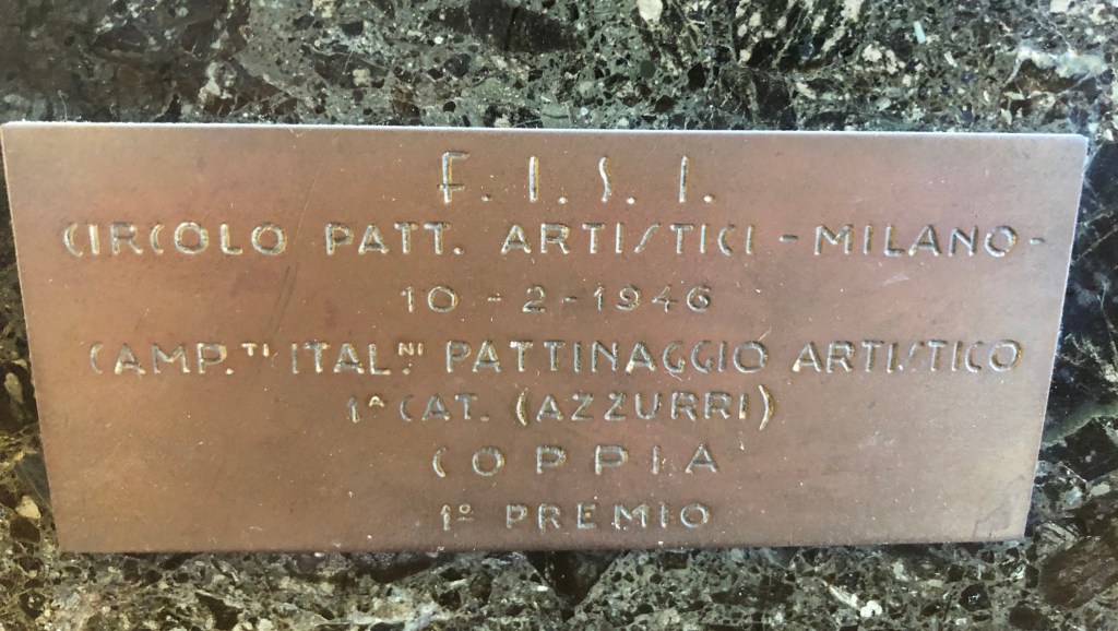 La coppa della prova di coppia, vinta da Grazia Barcellona assieme Carlo Fassi ai Campionati Italiani di Milano 1946, si contraddistingue non solo per il peso (dovuto alla base in pietra), ma anche al fatto che l’immagine prescelta richiamava il logo del Circolo Pattinatori Artistici di Milano: un biscione milanese incrociato con un pattino.