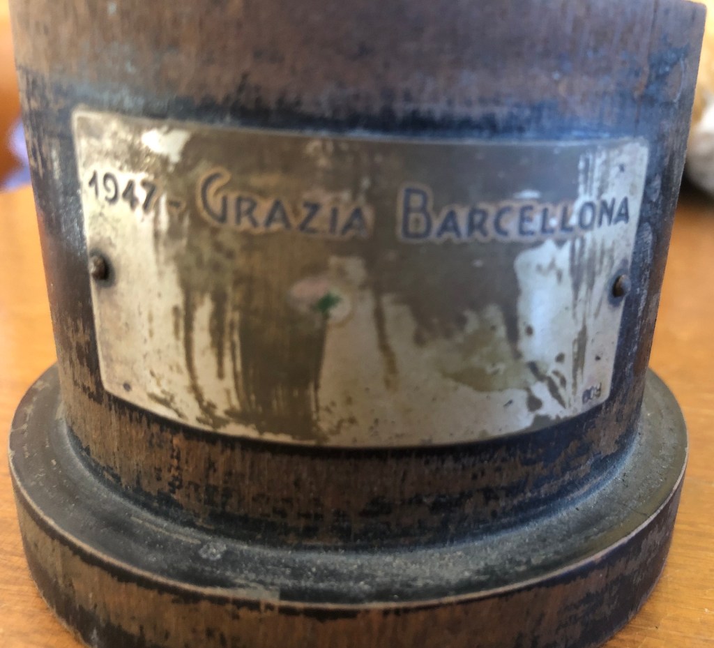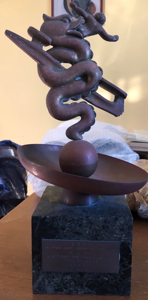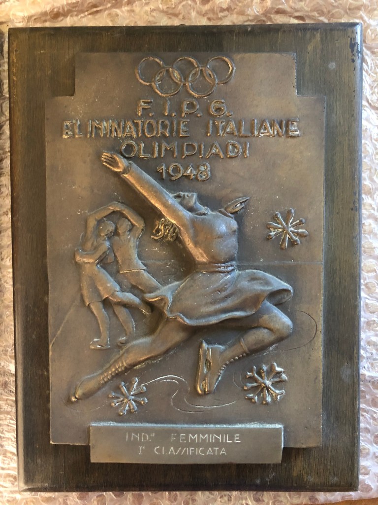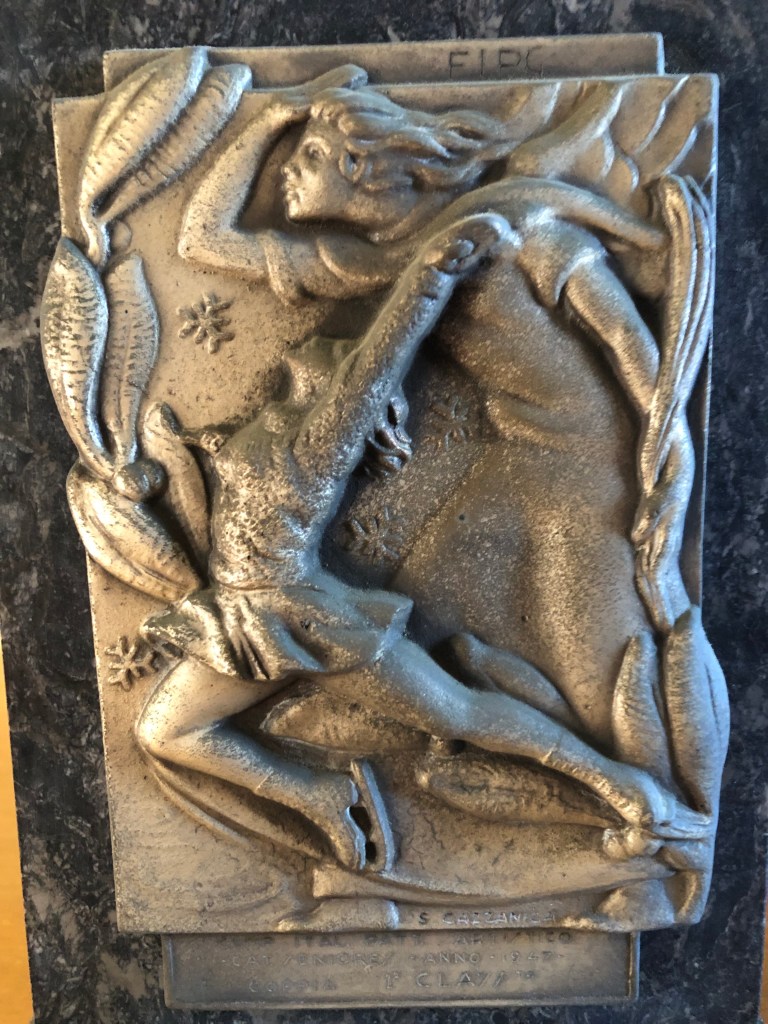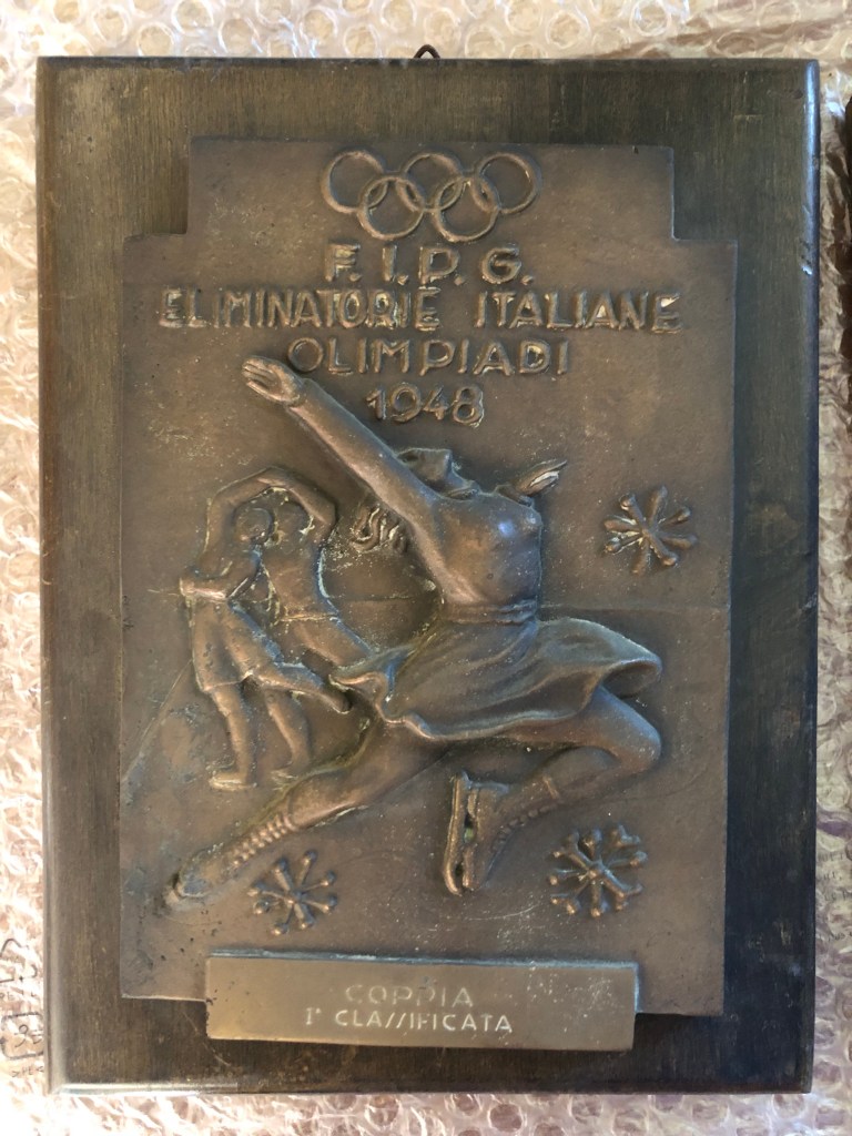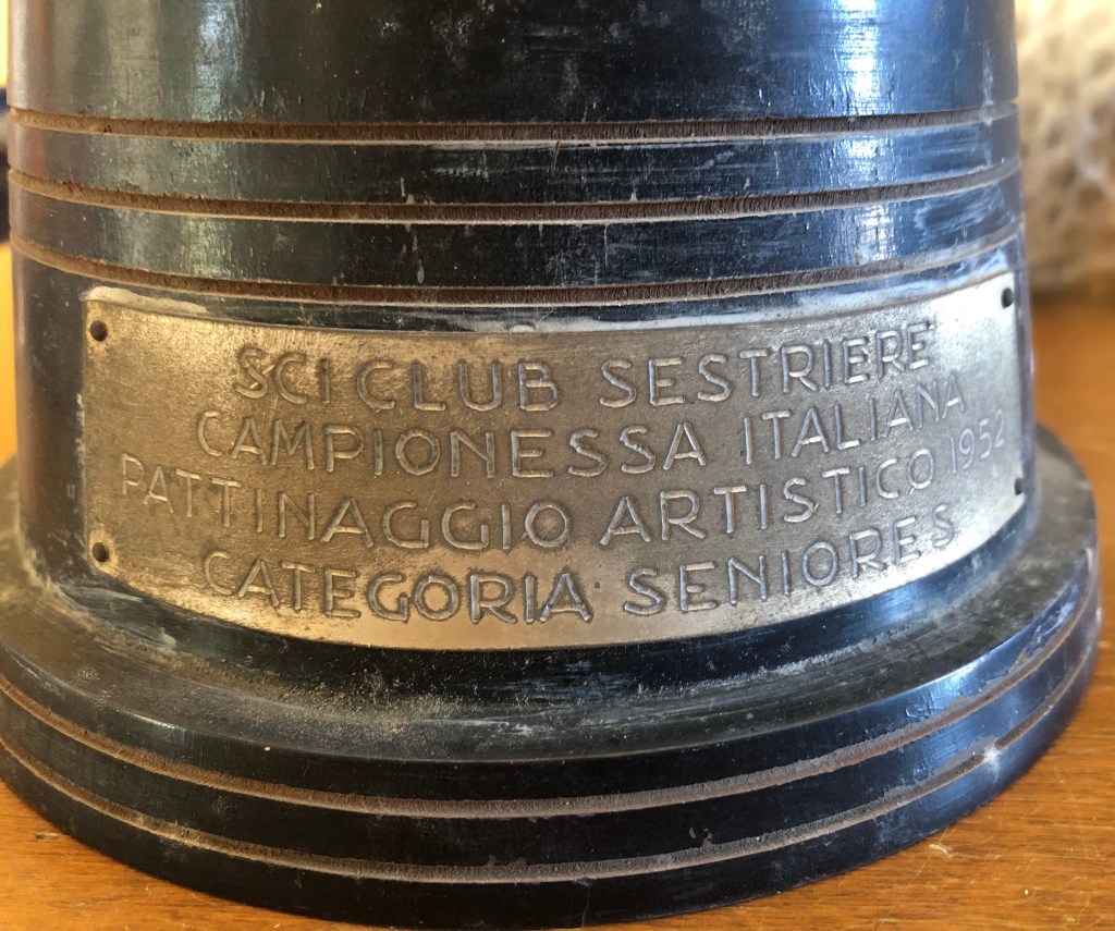 La coppa della prova di coppia, vinta da Grazia Barcellona assieme Carlo Fassi ai Campionati Italiani di Milano 1946, si contraddistingue non solo per il peso (dovuto alla base in pietra), ma anche al fatto che l’immagine prescelta richiamava il logo del Circolo Pattinatori Artistici di Milano: un biscione milanese incrociato con un pattino.