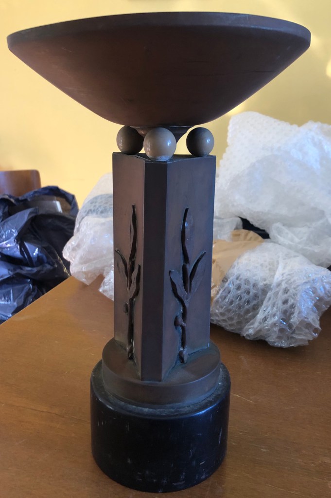 La coppa, caratterizzata da tre pallini di marmo colorati diversamente, e da un bassorilievo a forma di pianta, manca purtroppo di qualsiasi dato: molto probabilmente, la targhetta un tempo presente sulla base si è staccata.
