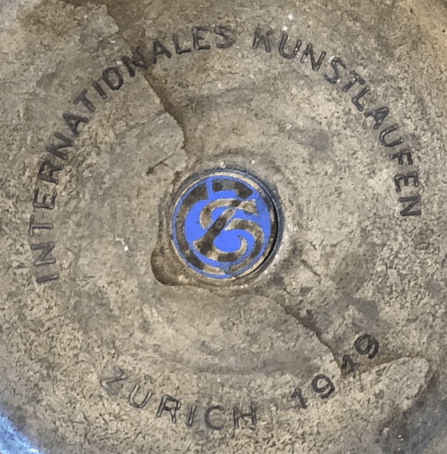 I due piattini, riportanti al centro un logo blu smaltato, e attorno ad esso la scritta “Internationales Kunstlaufen | Zürich 1949”, sono il souvenir delle “(gare” internazionali di pattinaggio artistico” svoltesi a Zurigo nel 1949.