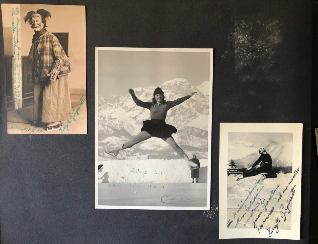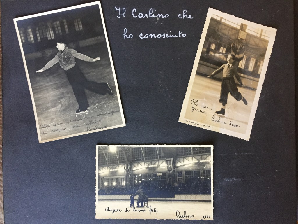 Non ci stupiamo allora che la pagina seguente sia dedicata proprio a Carlo “Carlino” Fassi, il partner sportivo di tutta una vita. La didascalia manoscritta “Il Carlino che ho conosciuto” forse fa emergere un filo di nostalgia: Grazia con Carlino pattinò fino ad un momento prima che quest’ultimo spiccasse agonisticamente il volo, conquistando i suoi più importanti successi in pista, fra il 1953 e il 1954. Due fotografie su tre sono datate al 1939.