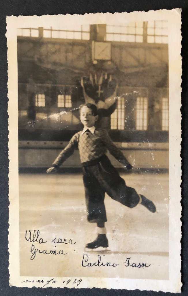 Nella seconda fotografia, datata marzo 1939, vediamo un Carlino più piccolo, il quale scrive con una grafia più incerta la dedica “alla cara Grazia | Carlino Fassi”: la prima fotografia potrebbe quindi essere posteriore. Ci troviamo sempre nel Palazzo del Ghiaccio, davanti all’orologio, sotto il quale si intravedono una serie di bandiere tricolori.